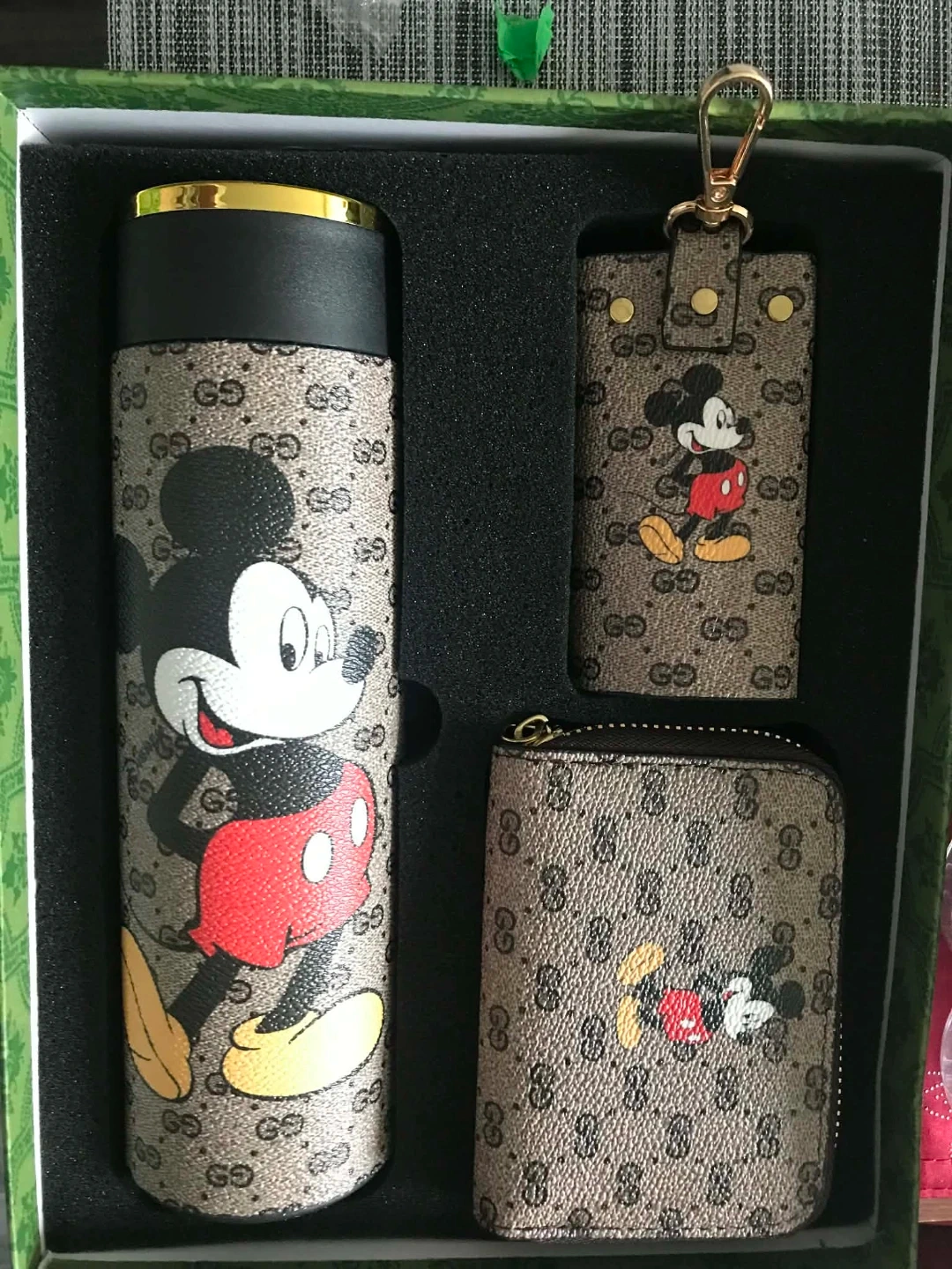 This set includes a travel mug, a card holder, and a keychain, all featuring a Mickey Mouse design with a brown and gold monogram pattern. The travel mug has a black lid with a gold accent. The card holder is a zippered pouch, and the keychain has a gold clip,the mug has a temperature.