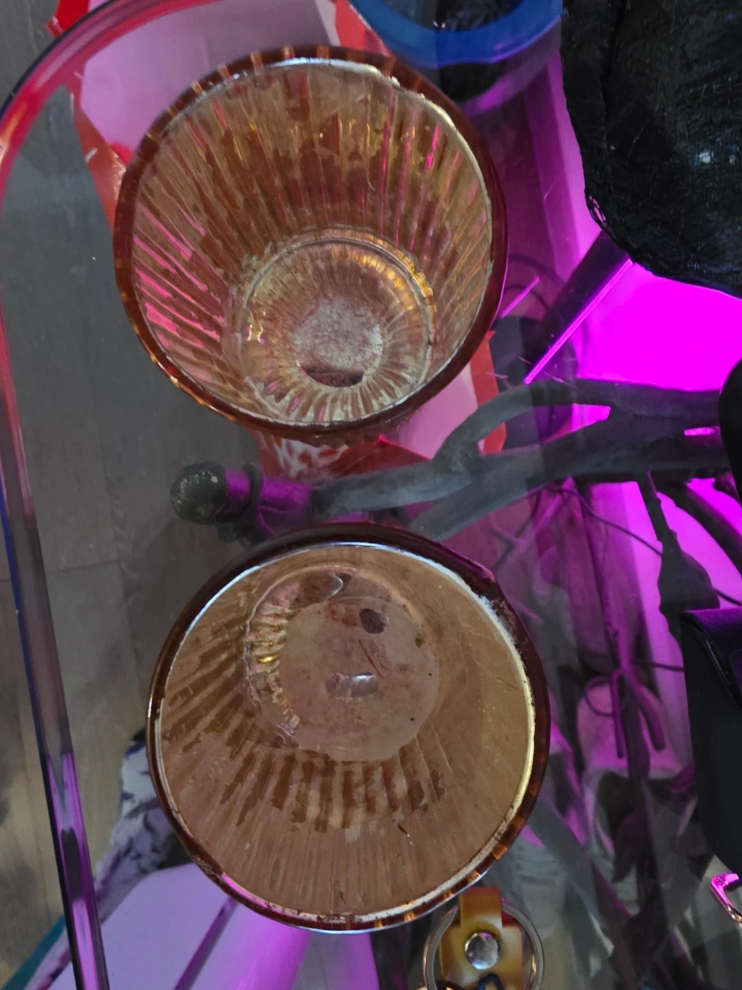 Two amber glass votive candle holders with a ribbed texture. They have a metallic sheen and a slightly irregular rim. Perfect for adding a warm glow to any space!