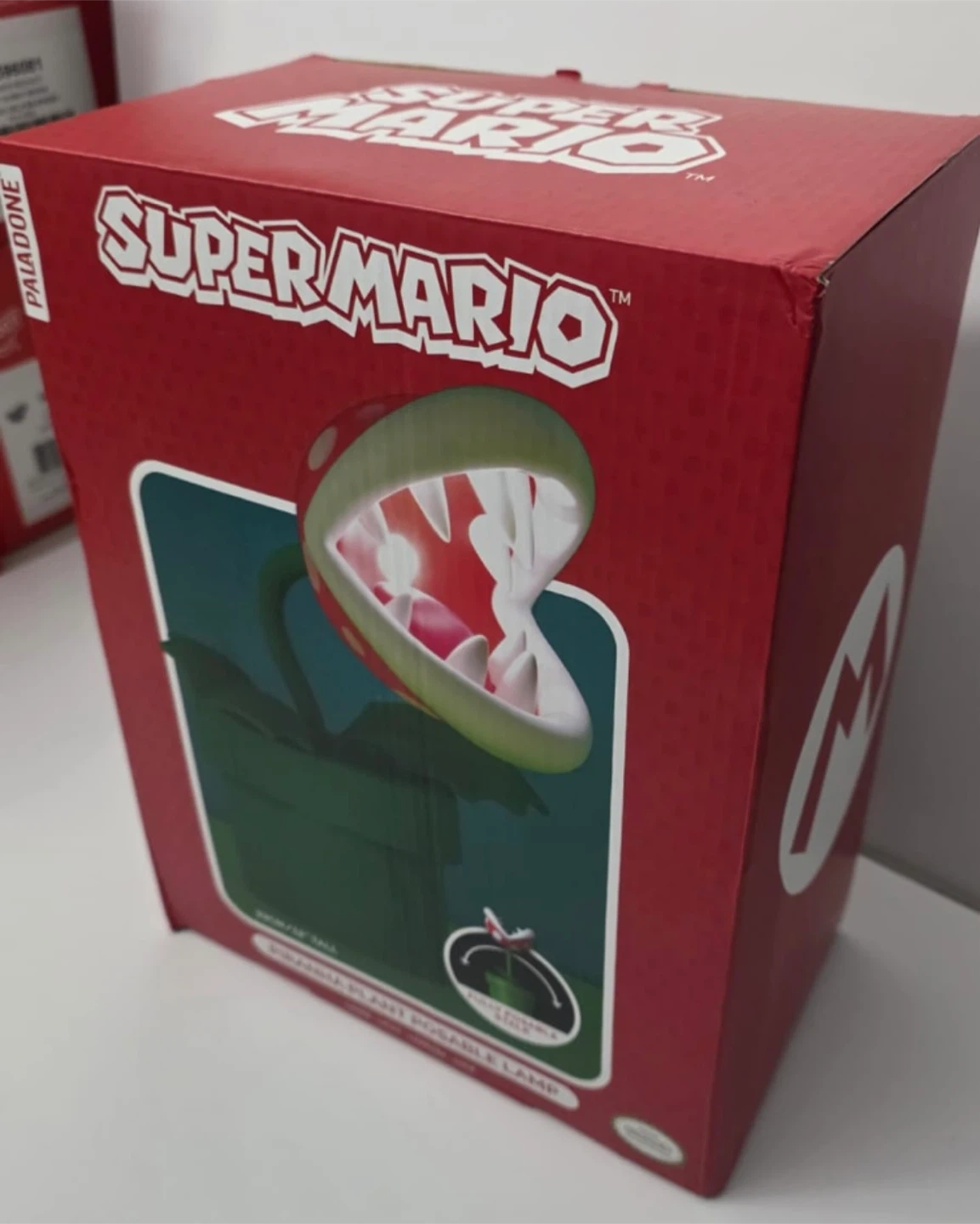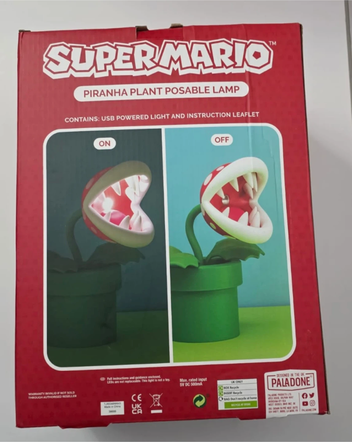 This is the Super Mario Piranha Plant Posable Lamp. It's USB powered and includes an instruction leaflet. This lamp has a posable neck for custom positioning!