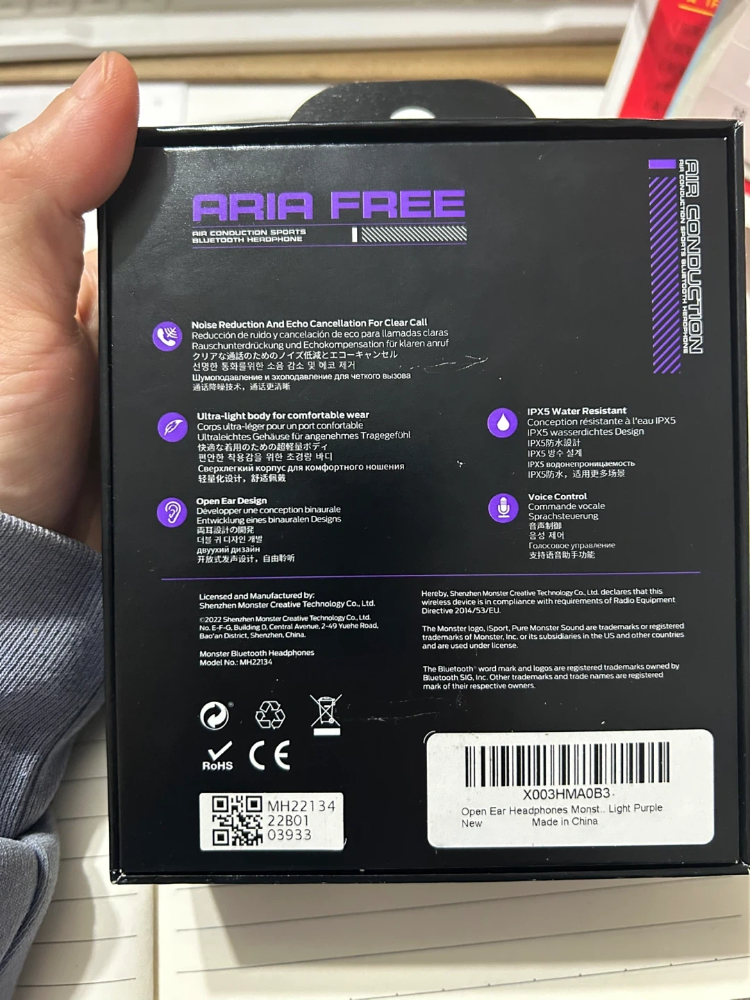 Monster Aria Free air conduction sports Bluetooth headphones. Features Noise Reduction and Echo Cancellation for Clear Calls. IPX5 water resistant with voice control capabilities. Lightweight design for comfortable wear.