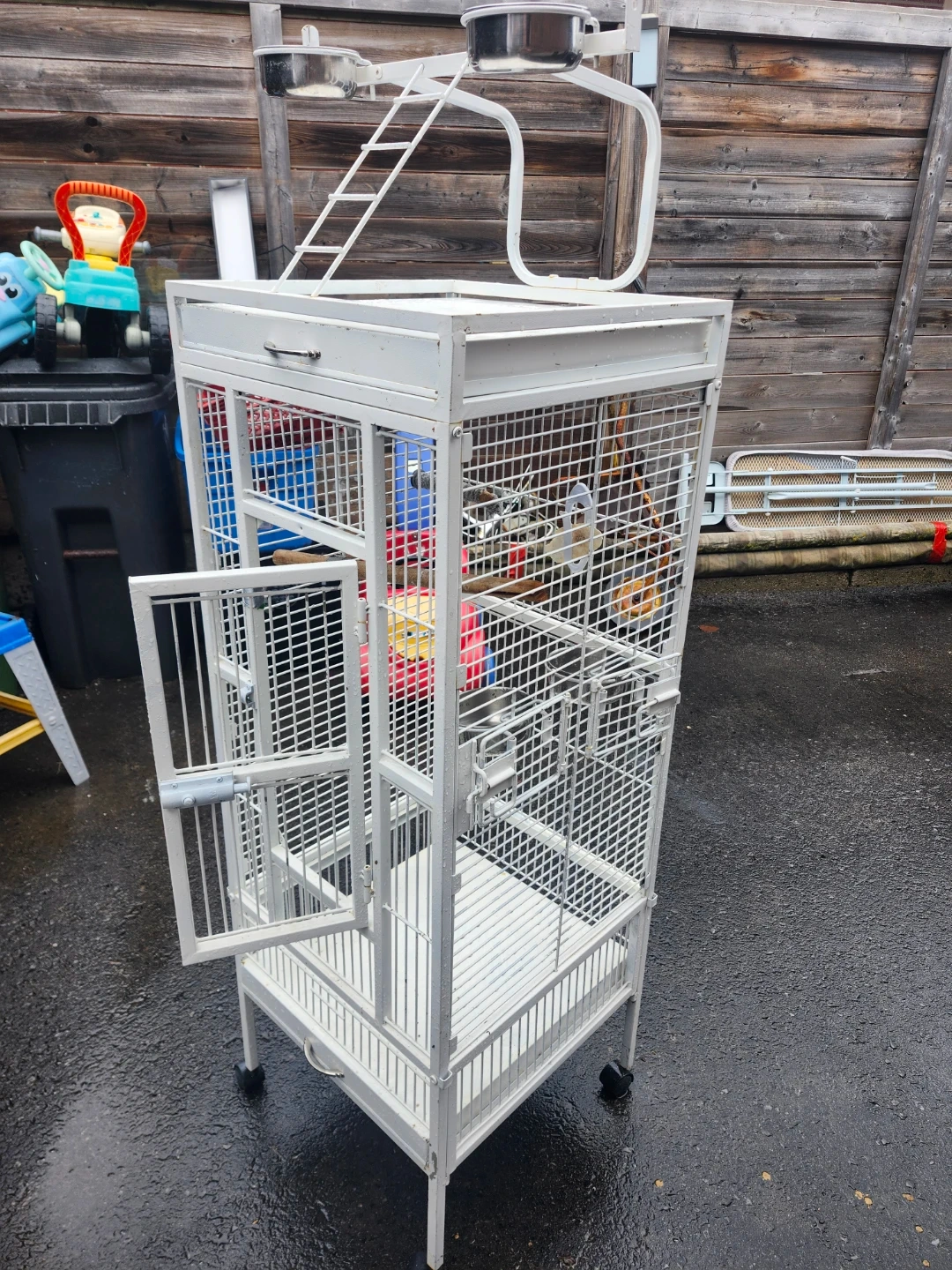 Spacious white bird cage with a pull-out tray for easy cleaning. It includes a top perch with two metal feeding cups and a ladder. The cage has wheels for convenient mobility. Perfect for medium-sized birds!