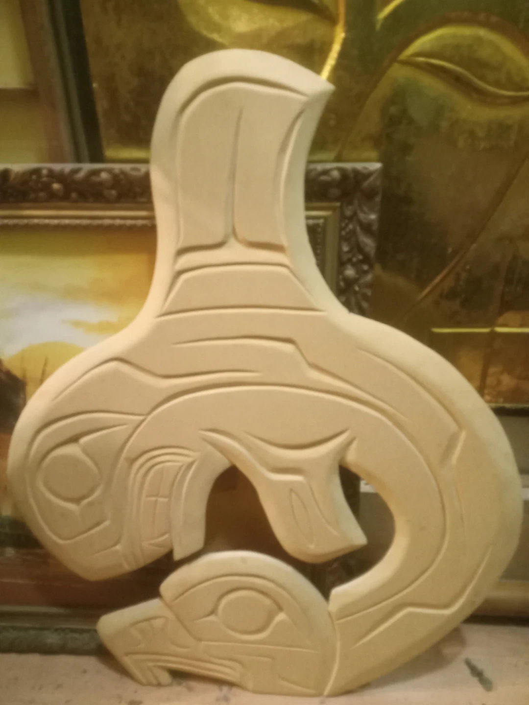 This is a hand-carved wooden art piece featuring a stylized totem pole design. The wood appears to be light-coloured, possibly pine or cedar, with intricate detailing. It's a unique decorative item for your home.