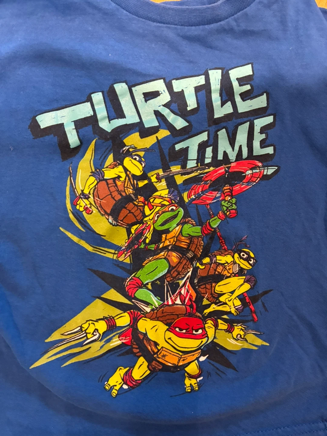 A bright blue t-shirt featuring the Teenage Mutant Ninja Turtles with 'Turtle Time' graphic. Made from 100% cotton. Size 3T.