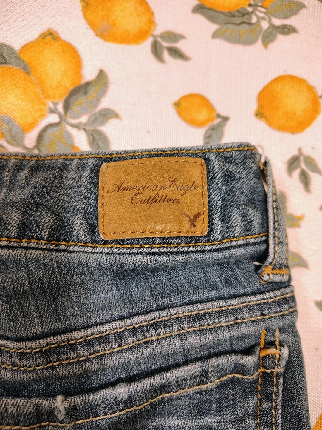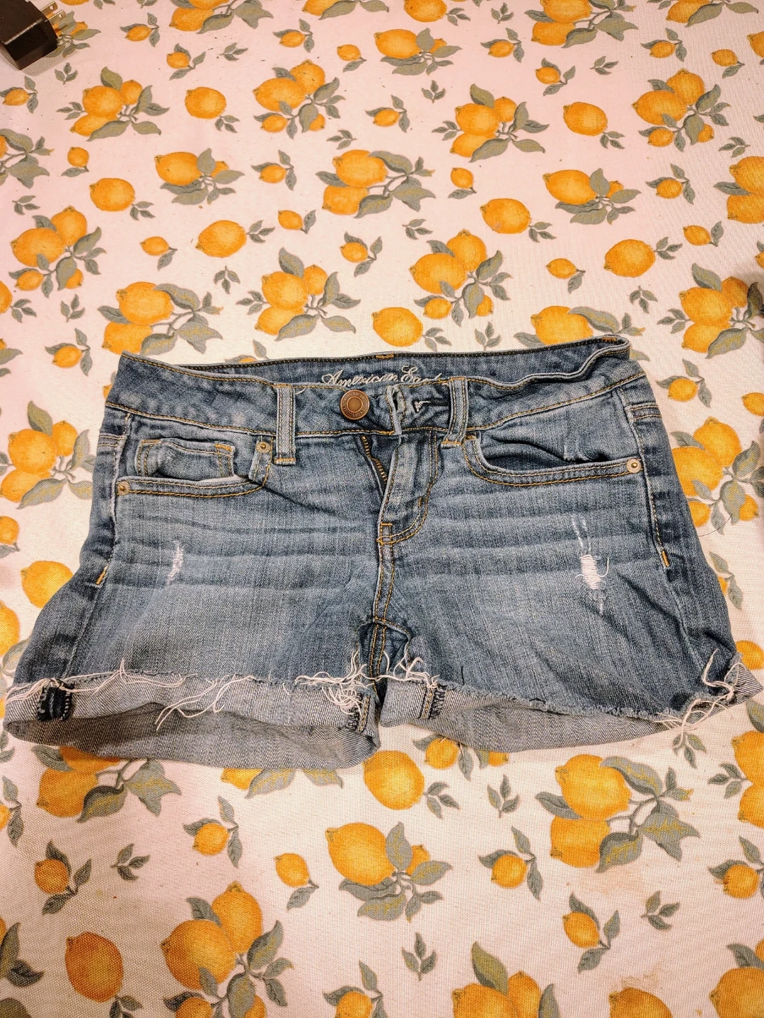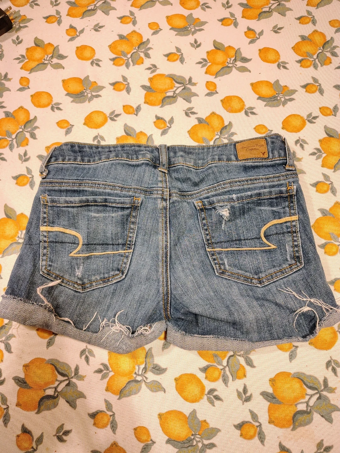 These are distressed denim shorts from American Eagle Outfitters. They are a size 2 and feature a classic blue wash. Perfect for casual wear and the spring break season.