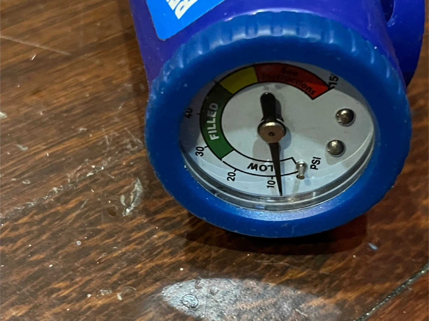 This reusable gauge and hose is designed for use with R-134a self-sealing valve cans. It features a built-in gauge to monitor pressure, with readings from LOW to 15 PSI, and a "FILLED" indicator. It's a handy tool for checking AC system pressure.