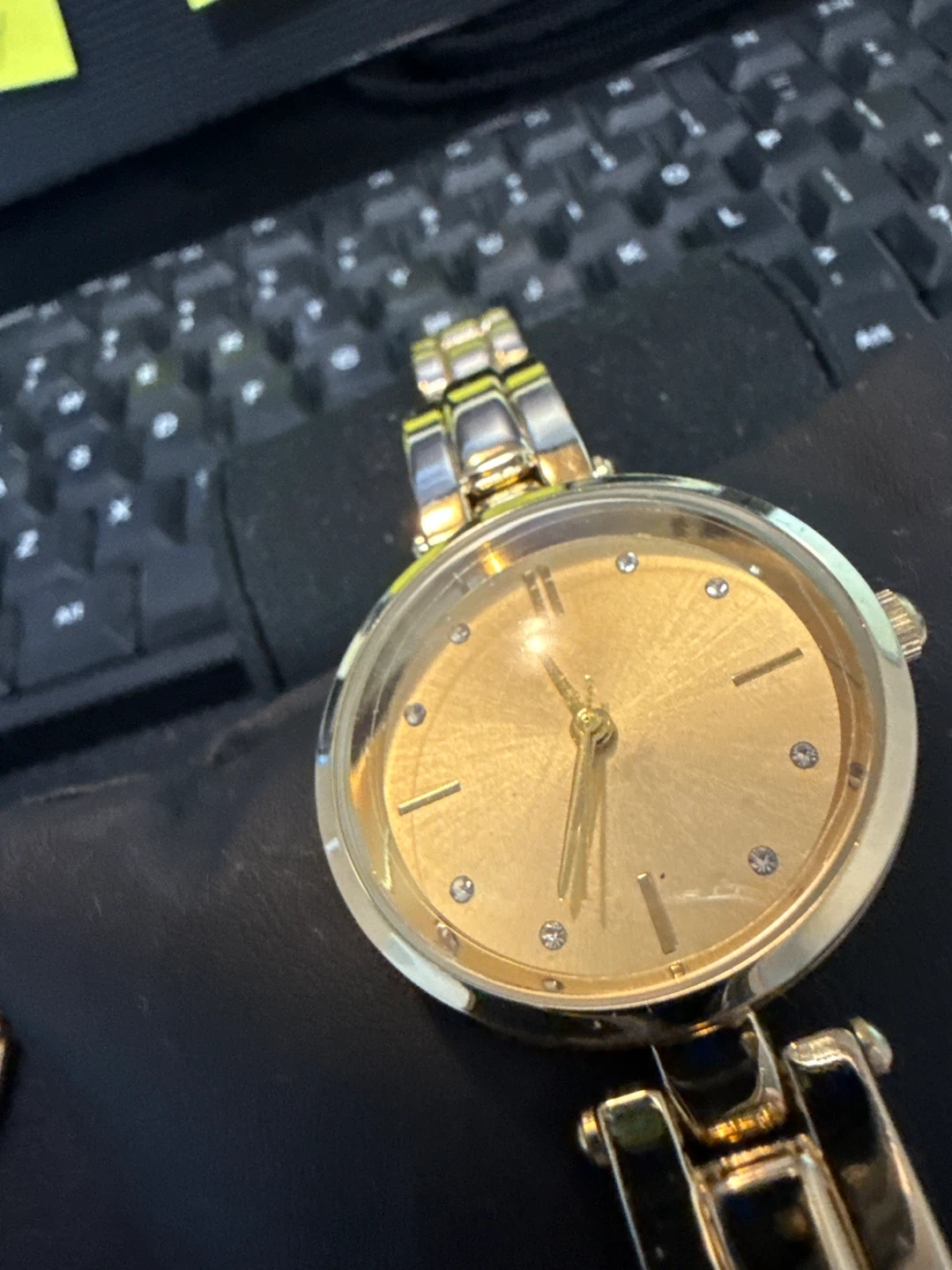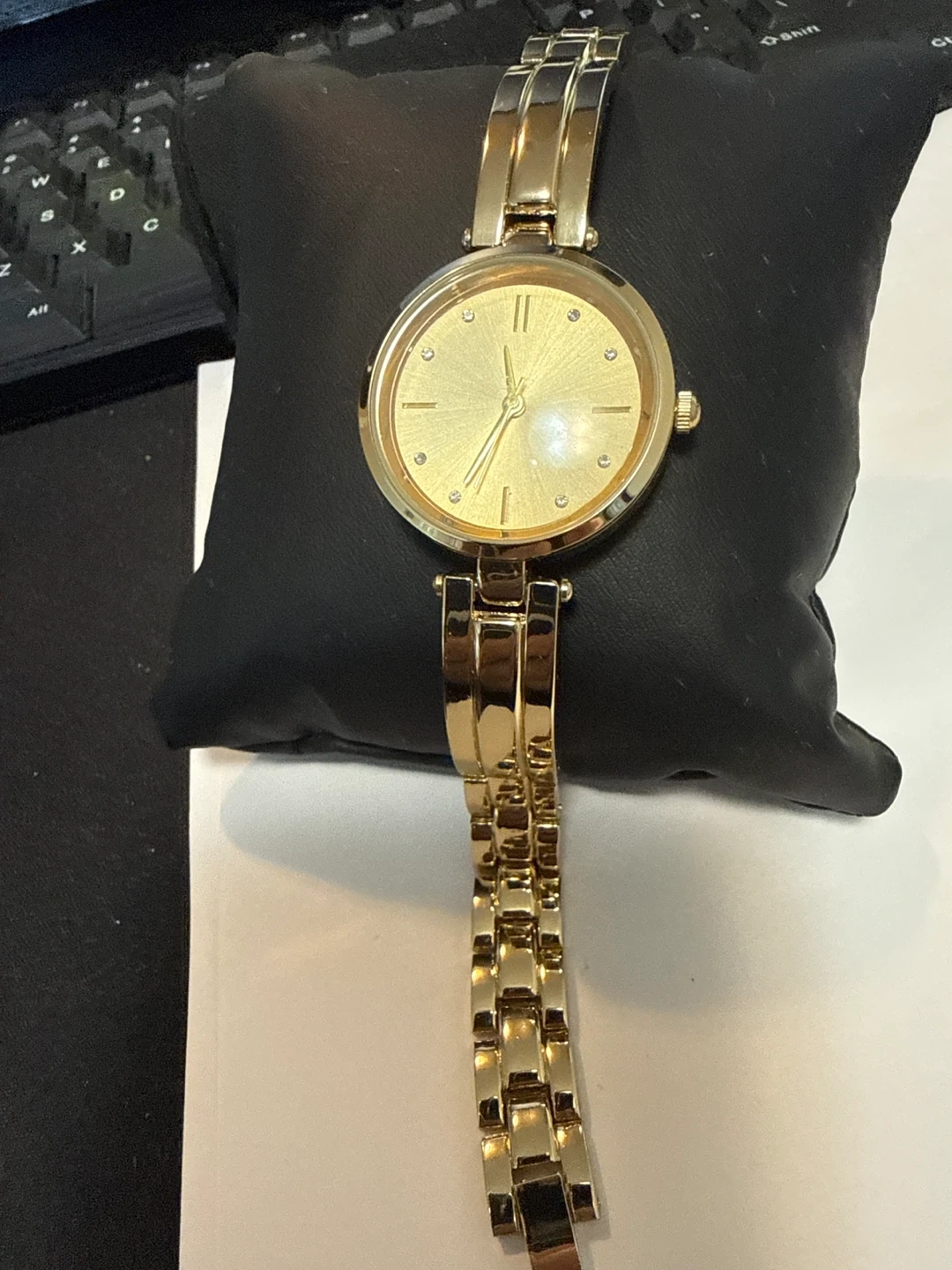 A classic gold-tone women's wristwatch with a simple, elegant dial. It features a comfortable metal link band. This watch is a stylish accessory for everyday wear.
