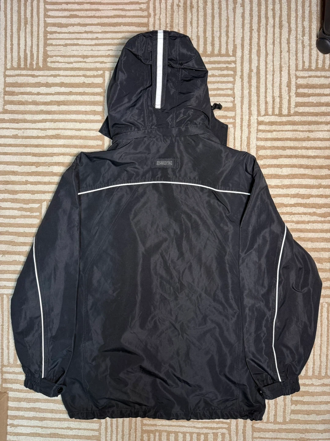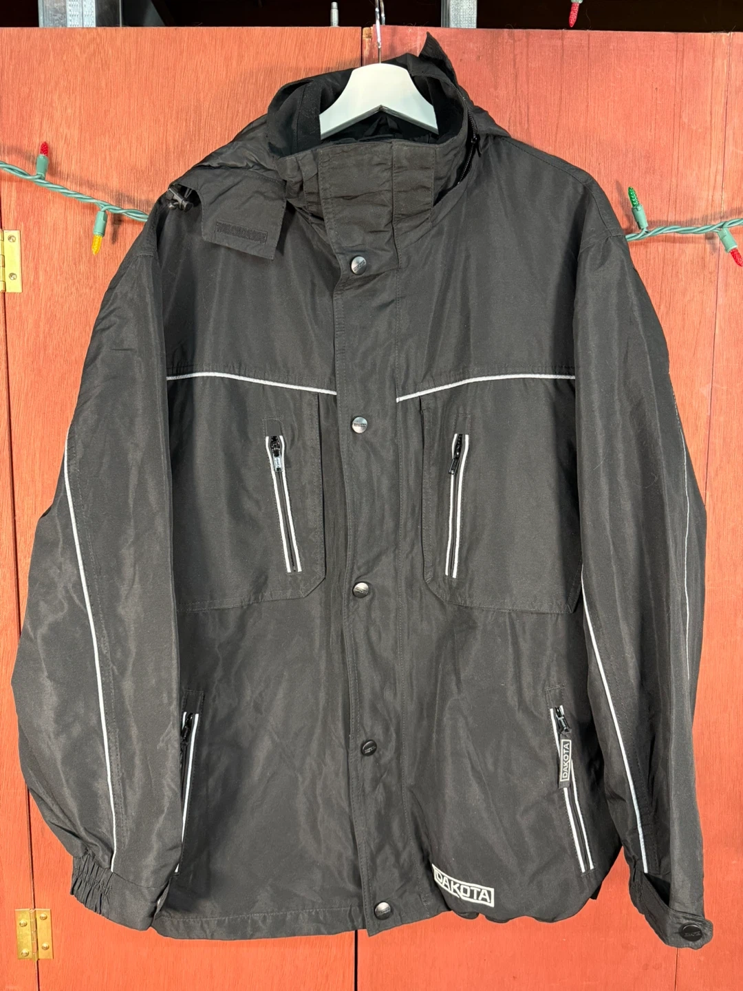 Dakota black hooded jacket with white piping details. It's a size M/M and made of 100% polyester shell with a polyurethane coating. Multiple zippered pockets are included.