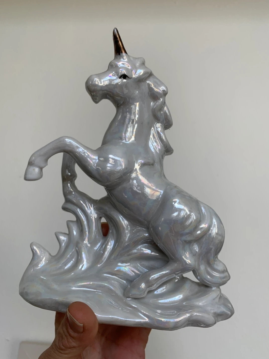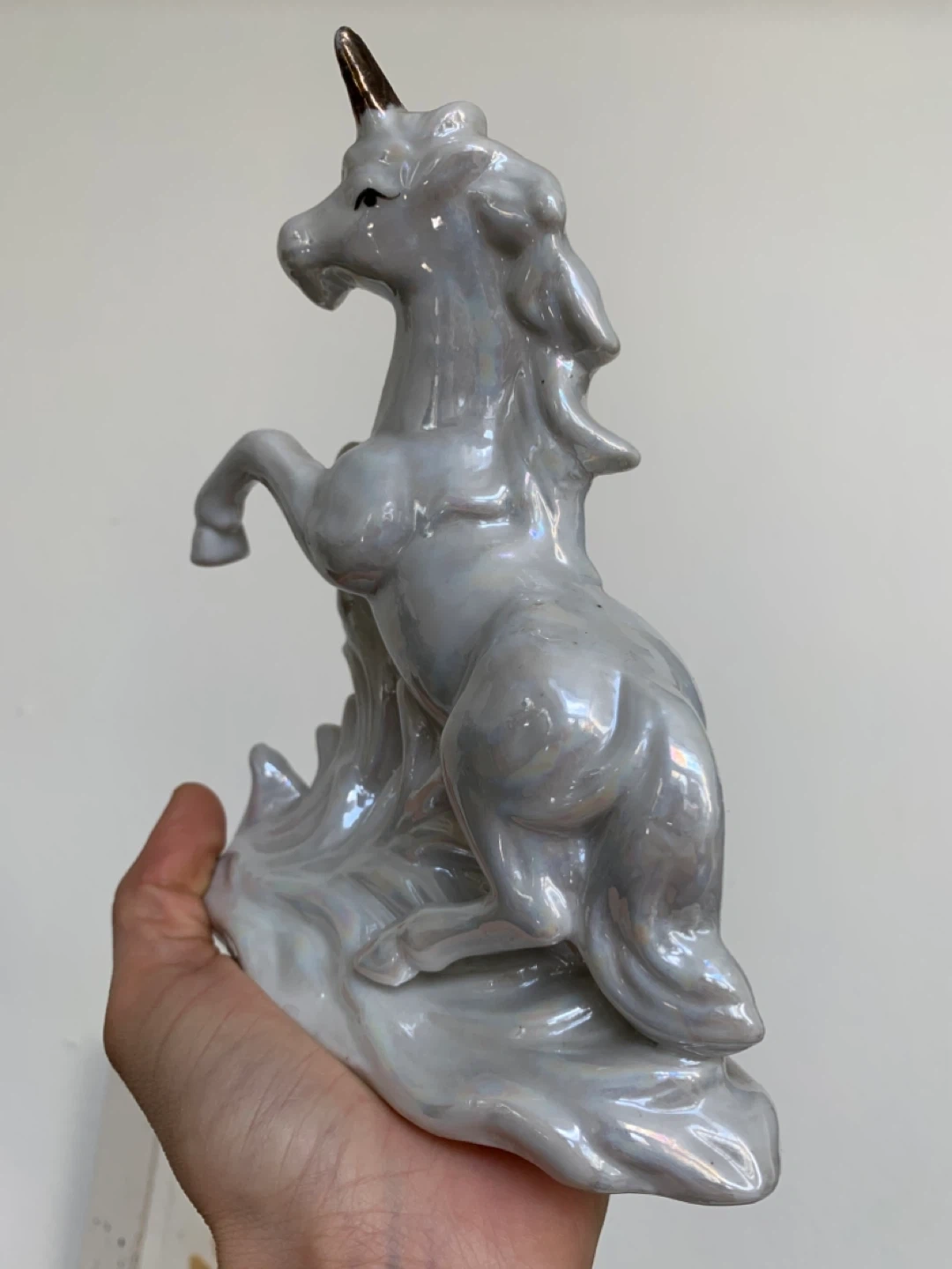 This is a pearlescent ceramic unicorn figurine, appearing to be in a rearing pose. It's a decorative piece with a glossy, iridescent finish that catches the light. The figurine is made of ceramic material.