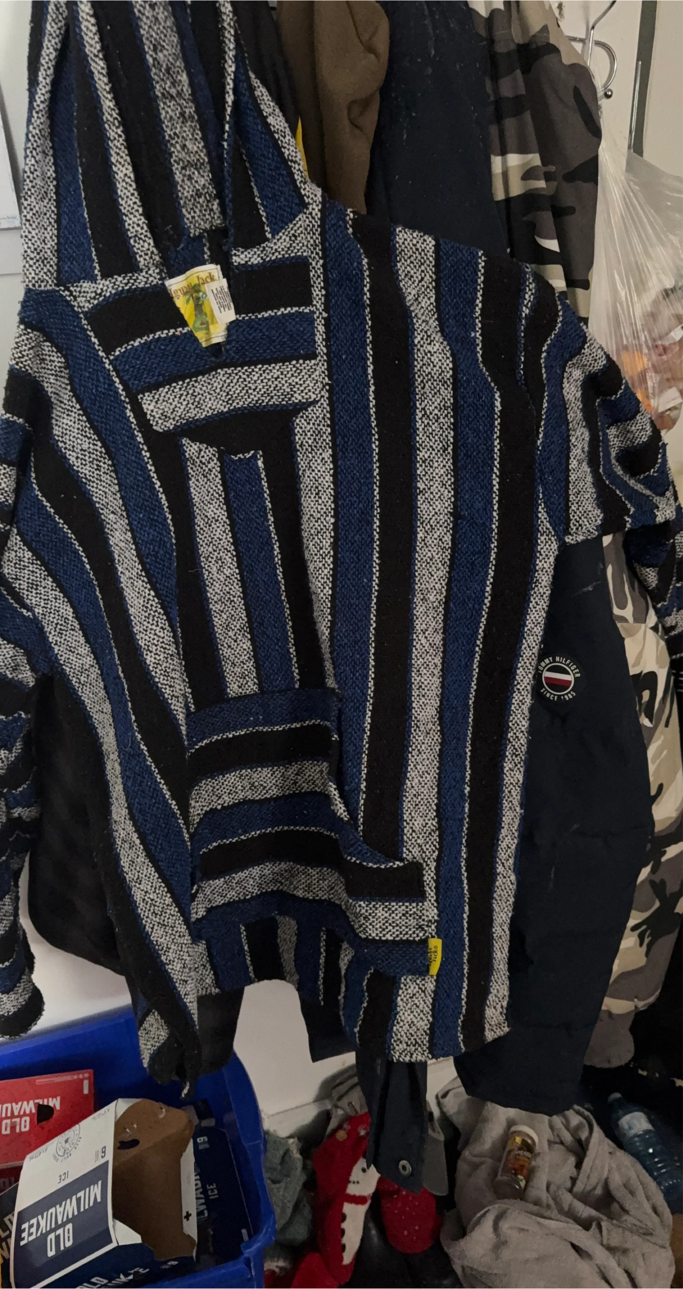 Baja hoodie with a blue, black, and white stripe pattern. It's a classic pullover style with a front pouch. This hoodie is great for casual wear, especially during cooler weather.