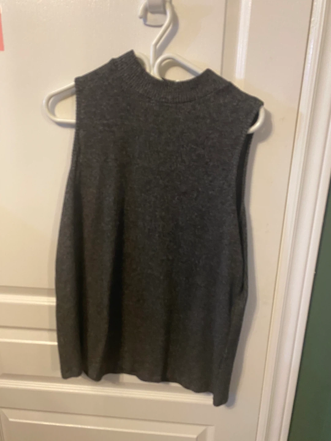 Sleeveless mock neck sweater in a heathered dark grey. It's a knit top perfect for layering during cooler weather.