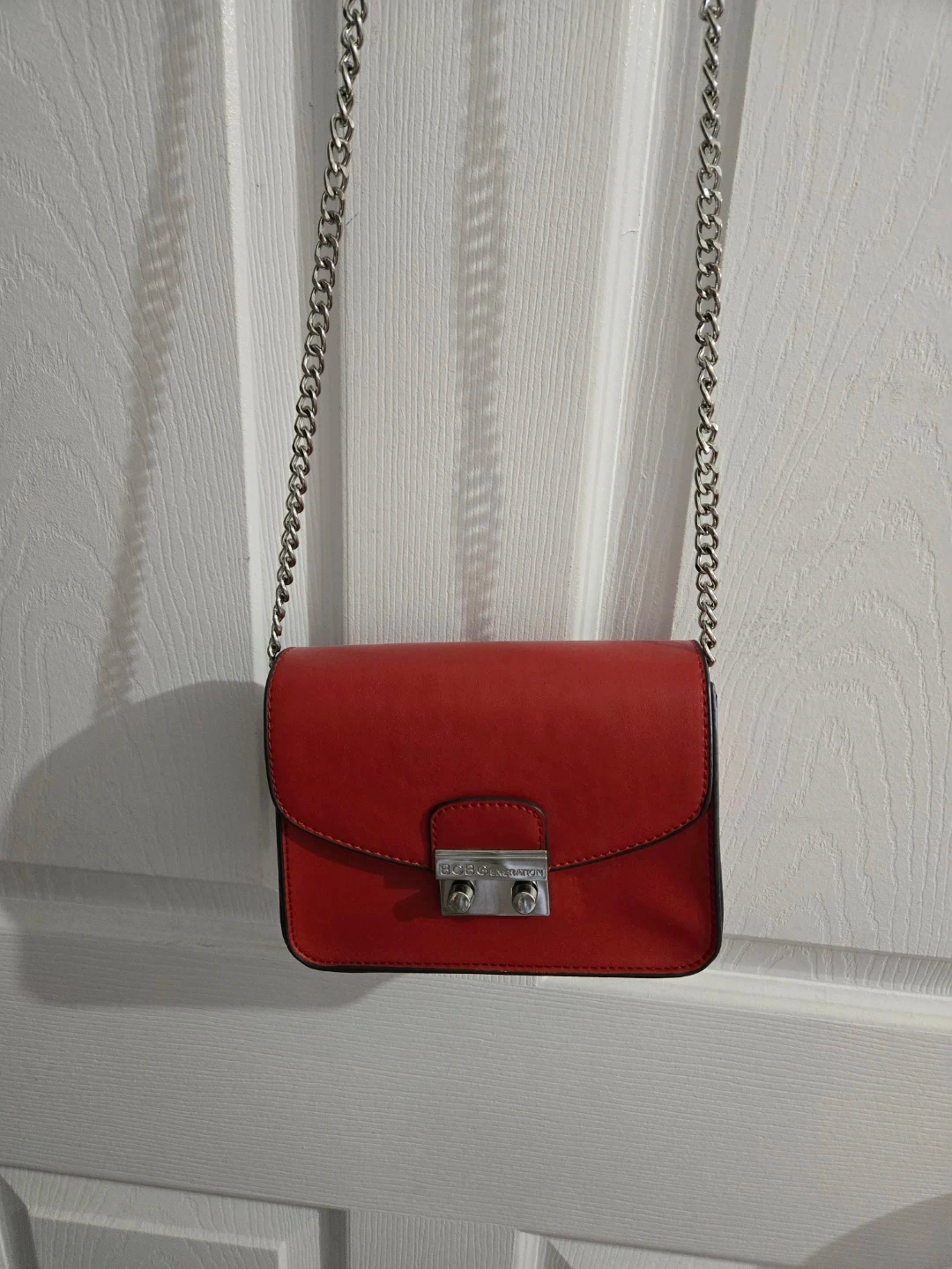 This is a stylish red crossbody bag from BCBG Generation. It features a silver-tone chain strap and a secure clasp closure. A great accessory for a night out or everyday use!