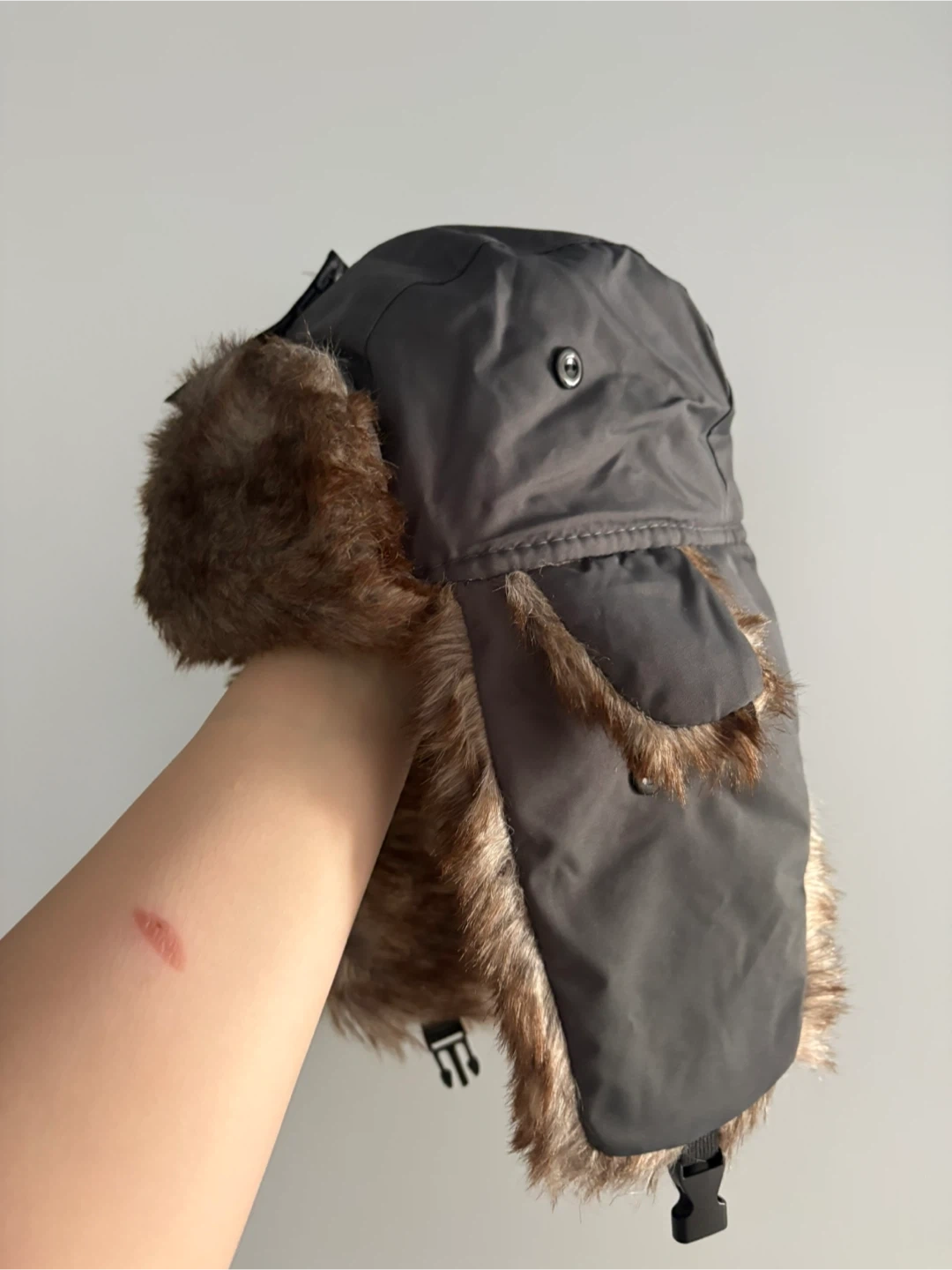 This black trapper hat features cosy faux fur lining and ear flaps. It has a toggle closure for a secure fit. Keep warm this winter!