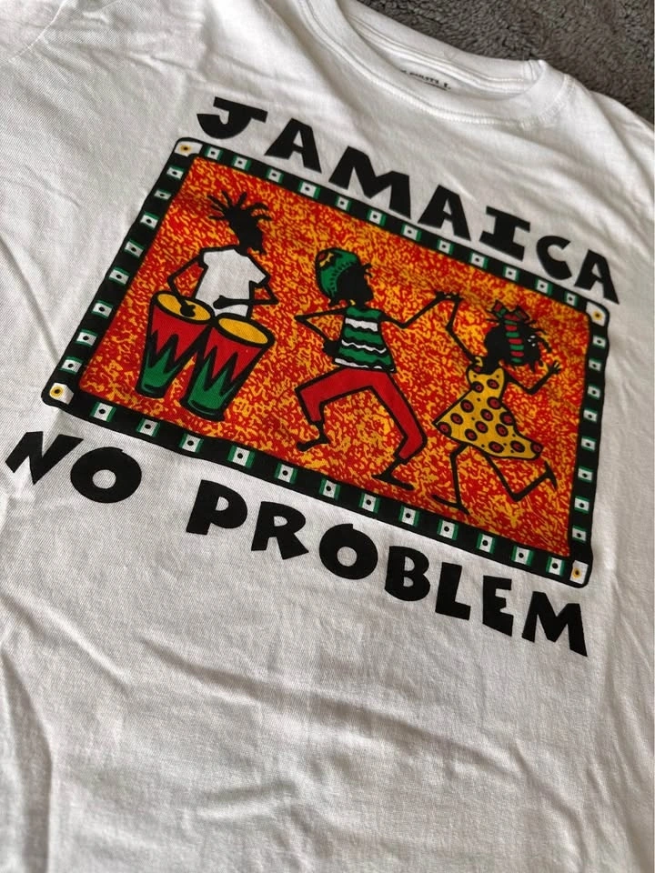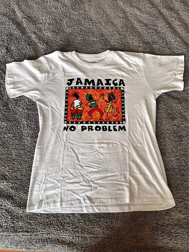 A perfect piece for those who love travel and laid-back style! Excellent Condition - Never Worn! Tag says Large (L), but it fits more like a Men's Medium (M). White t-shirt with large, colourful screen-printed graphic. Theme: Jamaica, Caribbean, Reggae, Souvenir. #Jamaica #NoProblem #CaribbeanStyle #Reggae #SouvenirTee #GraphicTee #TShirt #TorontoSales #SummerFashion #FestivalWear #VintageStyle #TravelWear #IslandVibes #TorontoMarketplace #CasualWear #YYZFashion #WhiteTee #NeverWorn #SizeMedium
