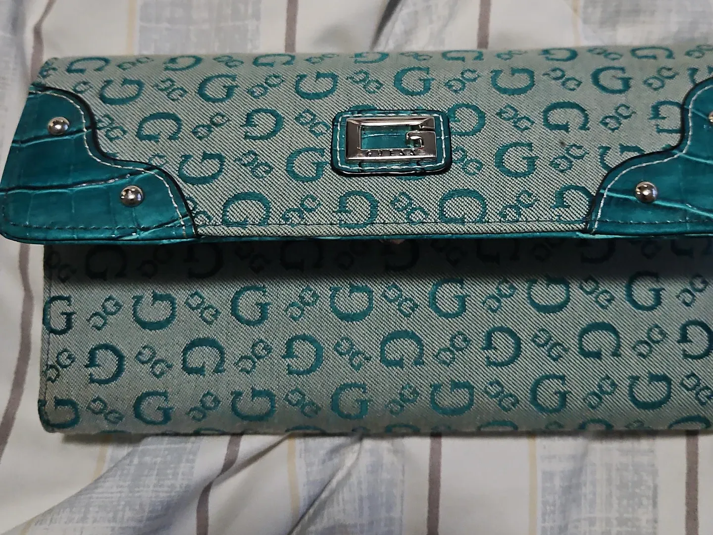 Guess wallet in teal with a repeating G logo pattern. Features green croc-embossed accents and a silver-tone buckle closure. It's a stylish accessory for carrying your essentials.