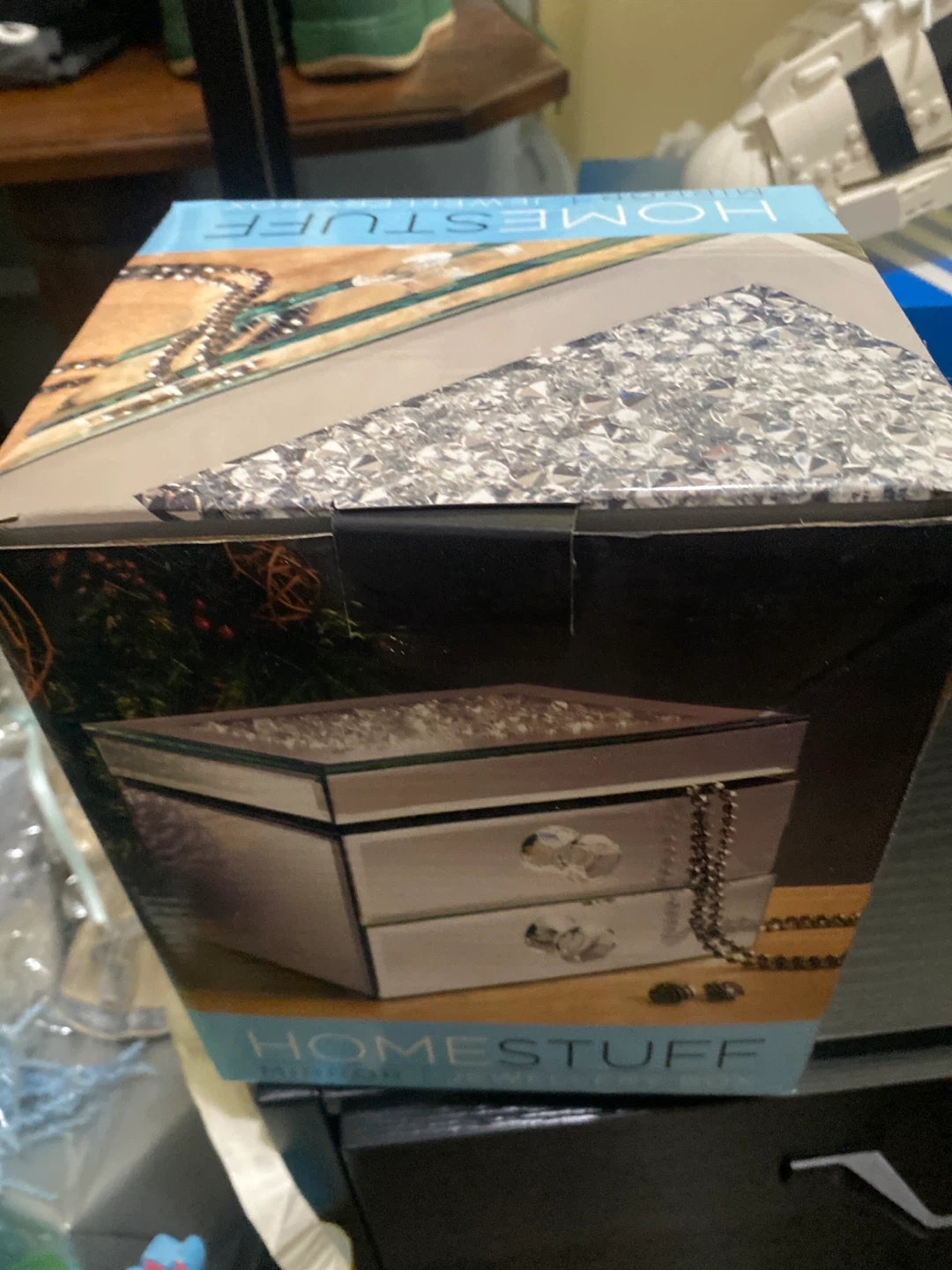 Stylish HOMESTUFF mirrored jewelry box with two drawers. It's ideal for keeping your rings, earrings, and necklaces organized. This box has a mirrored finish with crystal-like drawer pulls.