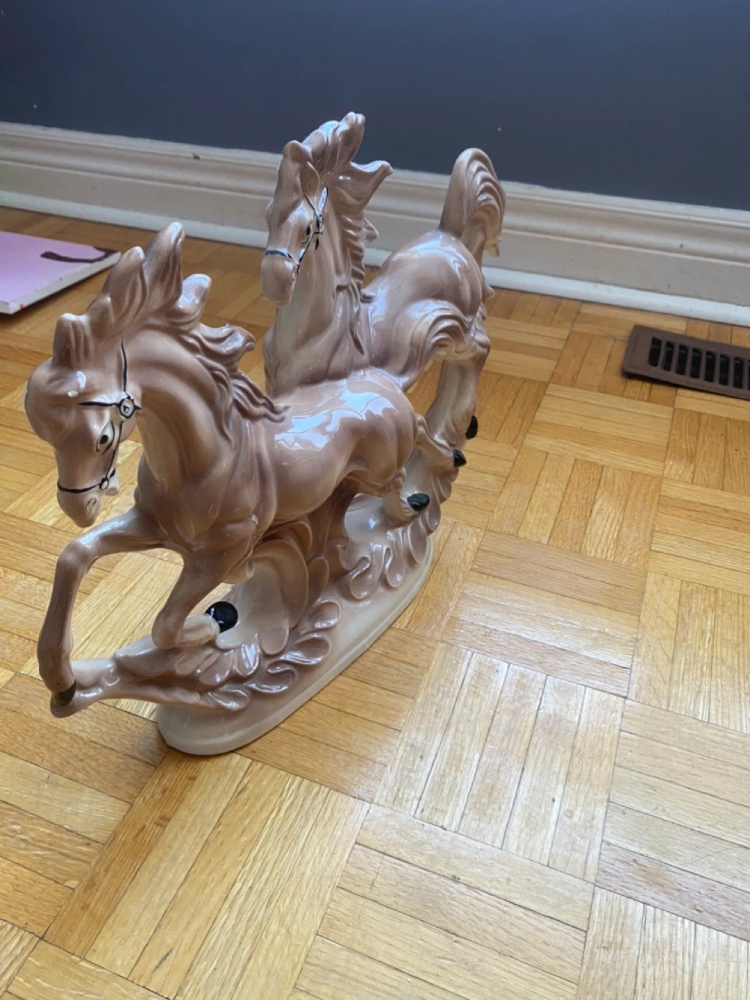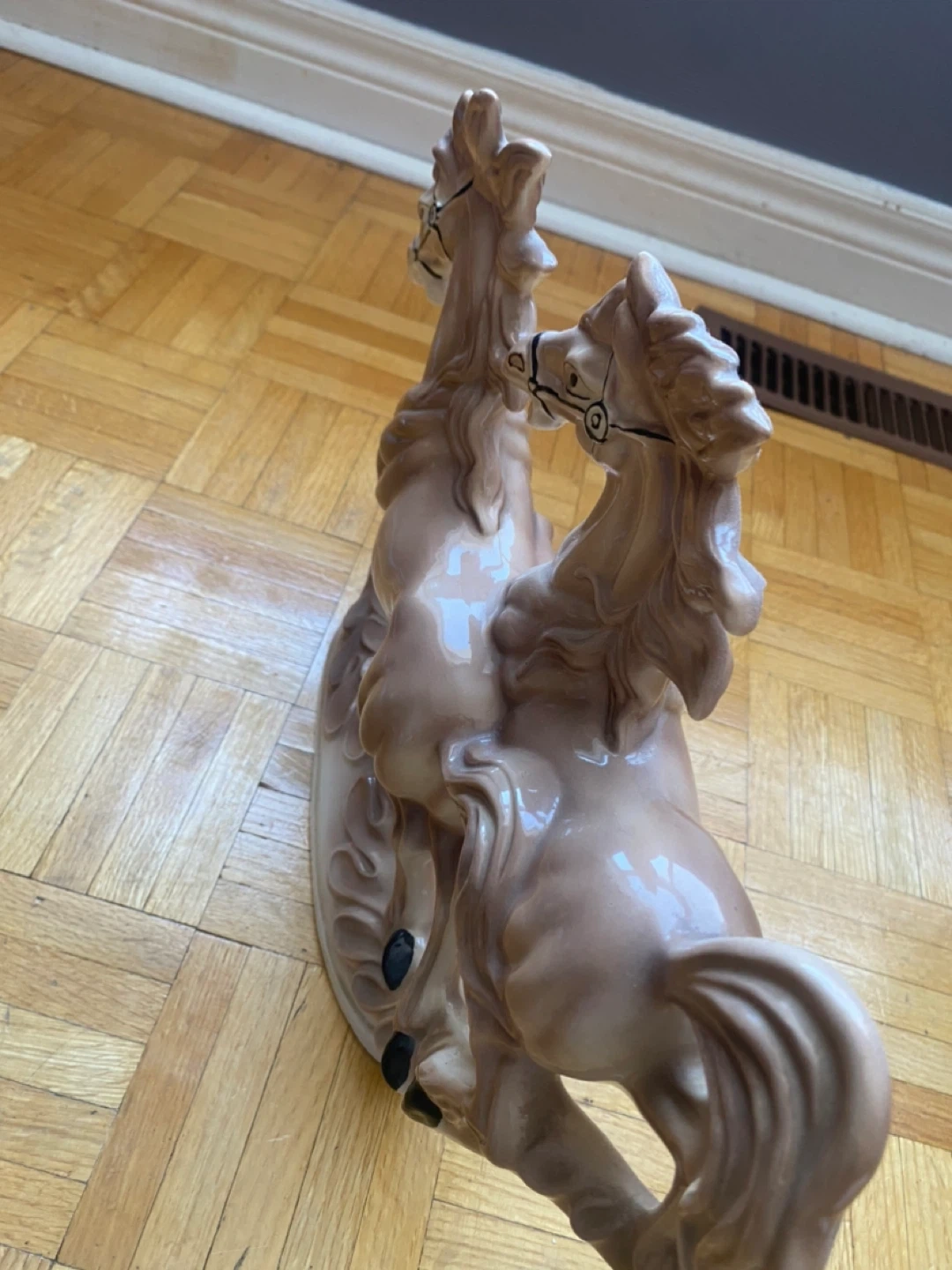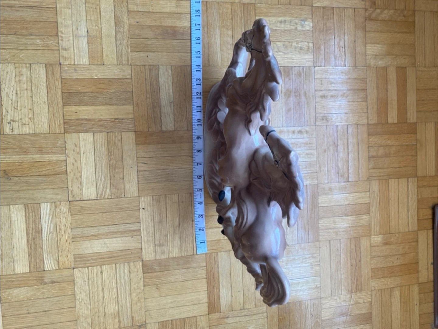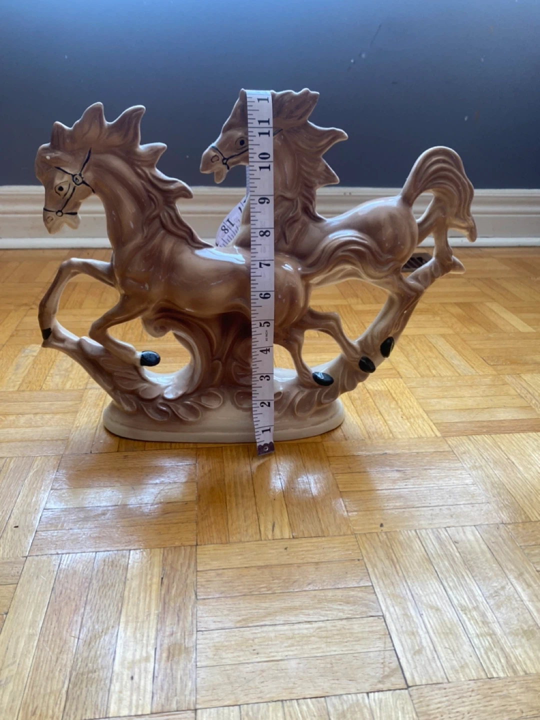 This is a ceramic statue featuring two horses. It measures approximately 11 inches tall. It's a nice decorative piece.