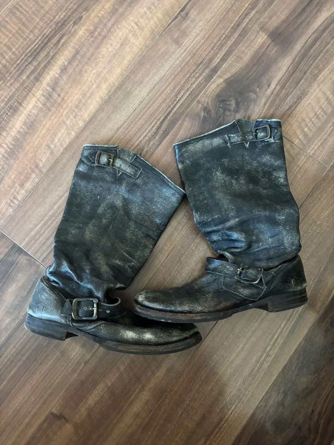 These are stylish FRYE black leather motorcycle boots. They are made in Mexico and feature buckle details. Leather.