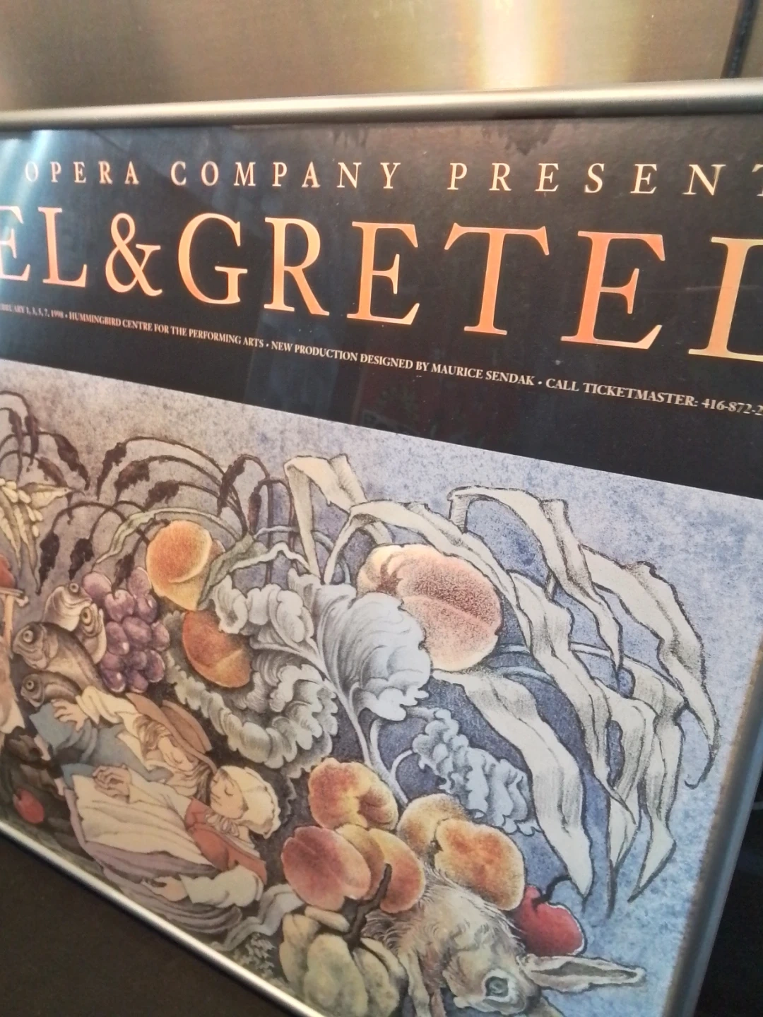 This poster advertises The Canadian Opera Company's production of Hansel & Gretel, performed in English. It features artwork by Maurice Sendak and was displayed at the Hummingbird Centre for the Performing Arts in January and February 1998. A great piece for opera fans or collectors of theatrical memorabilia!