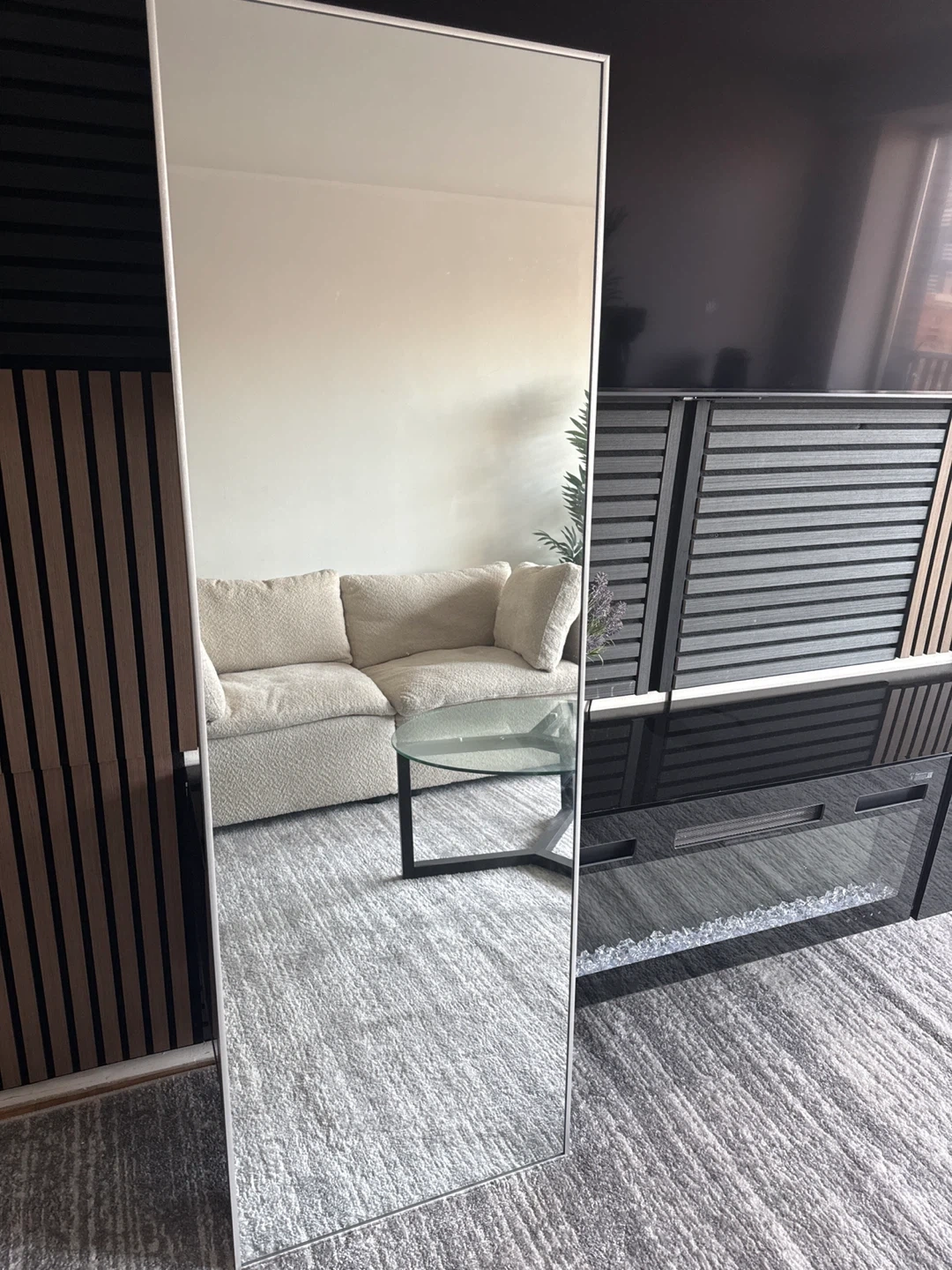 This is a full-length mirror with a sleek silver frame. It's perfect for checking your outfit before heading out. The mirror has a clear reflection and can be leaned against a wall or mounted.