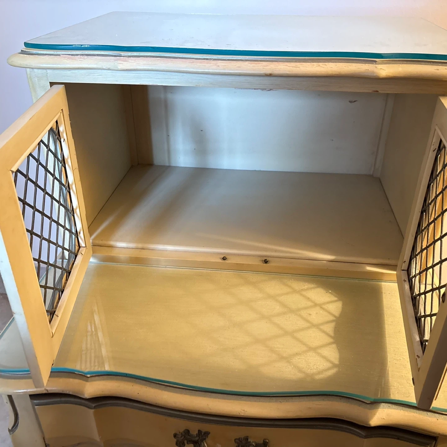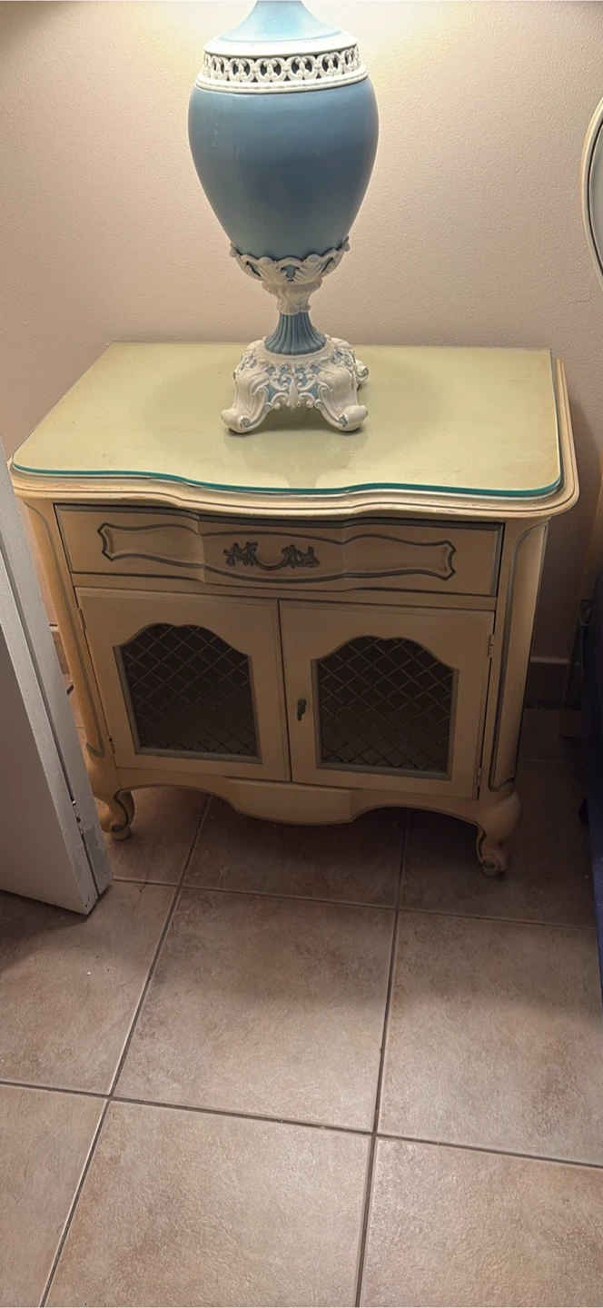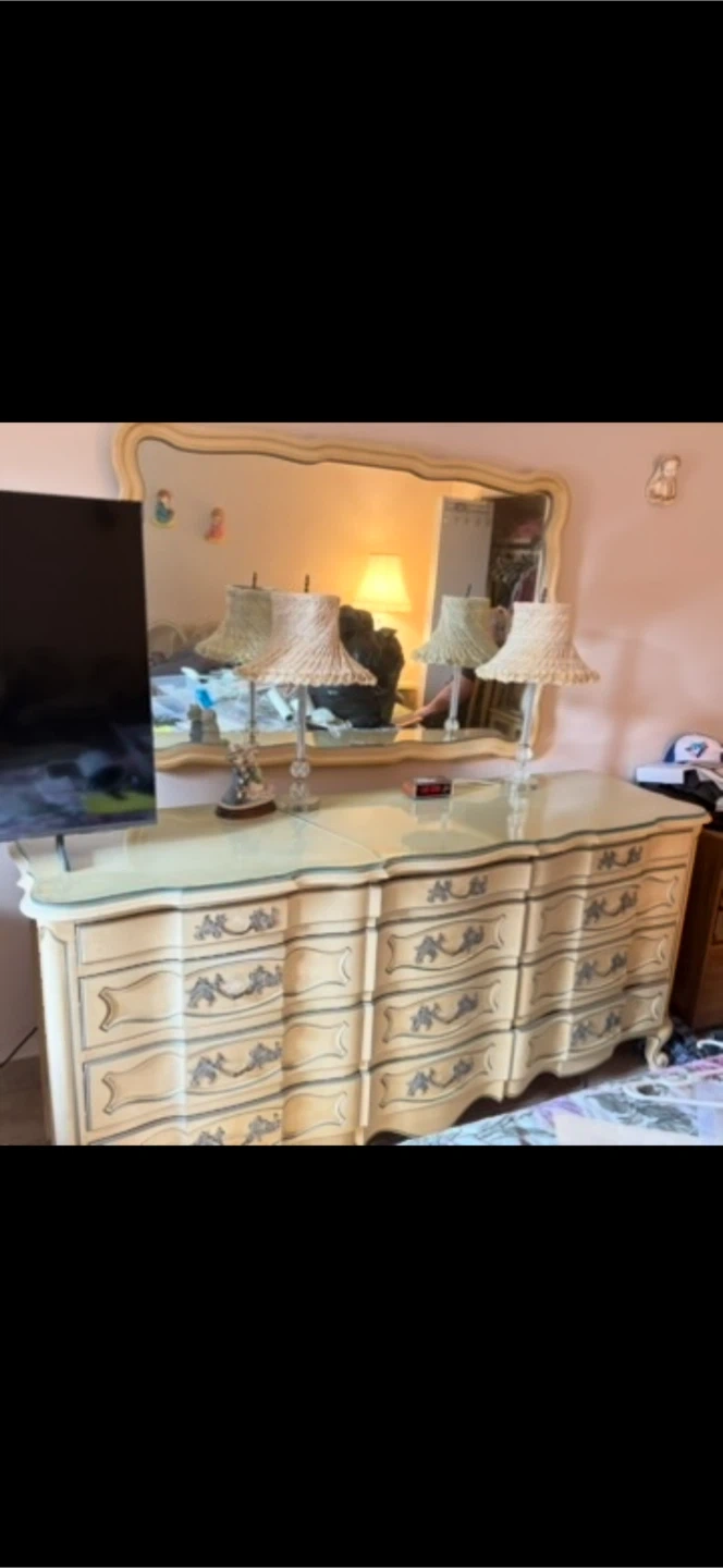 Cream coloured bedroom set. 3 tables and dresser, king bed frame can be included as well included. Originally purchased at whites fine furniture . pick up only