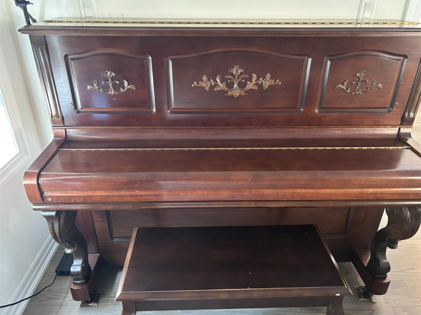 Beautiful dark wood upright piano (Young Chang U121) Includes matching bench. This piano is a lovely addition to any place for musical enjoyment. Giving away because of moving.