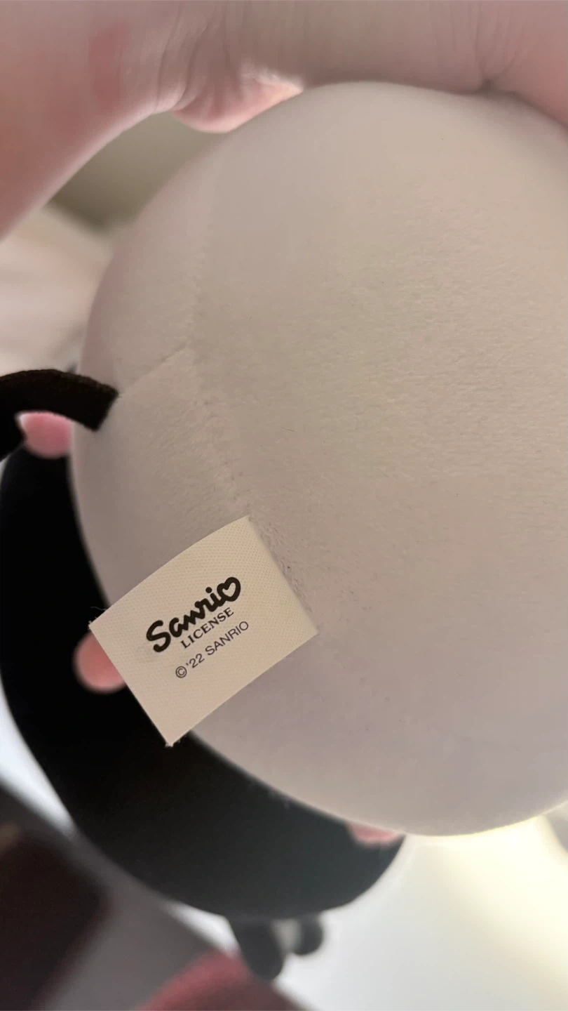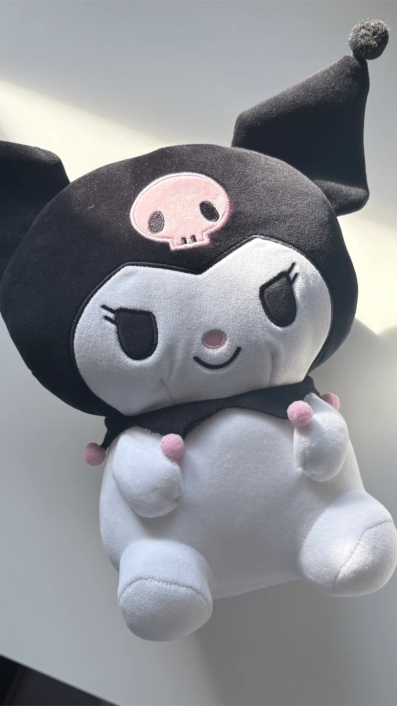 This is a Sanrio Kuromi plush toy. It's white with black ears and a black scarf. It has a pink skull detail on its forehead. Soft and cuddly! Legit licensed plush, and I got this from Korea! $25