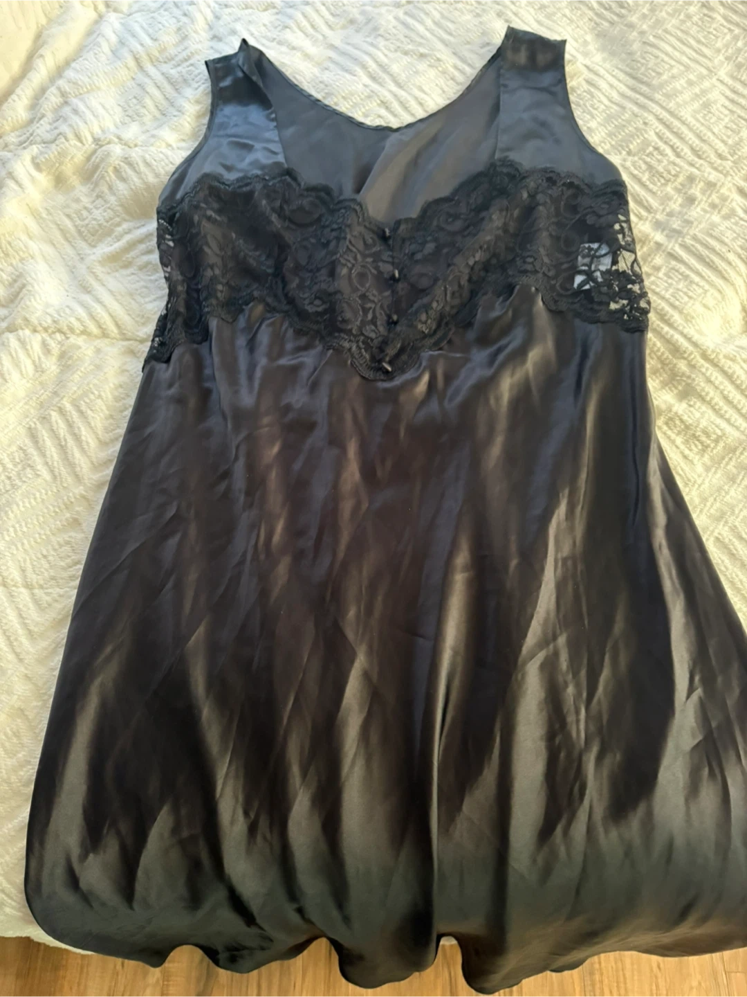 Two-piece lingerie set featuring a black satin nightgown with lace trim. Also includes a sheer black lace-trimmed robe. Both pieces are designed for comfort and elegance. it’s almost floor length!