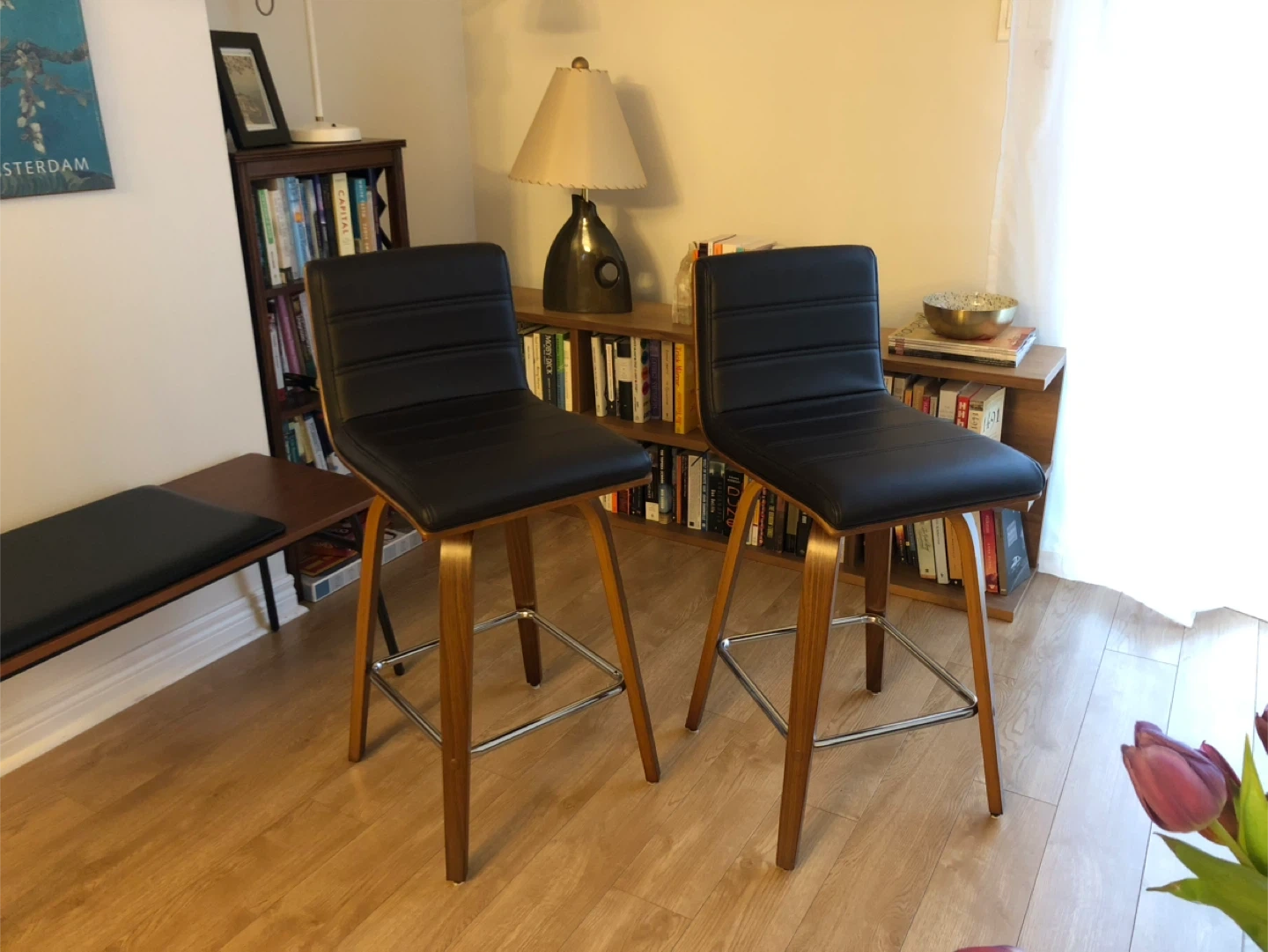 2 counter stools with dark brown faux leather seats and curved wood base. The seats swivel 360 degrees. They are in excellent condition. The padded seats are very comfortable. Used for 1 year but selling as we no longer need them. Price is for both stools together.