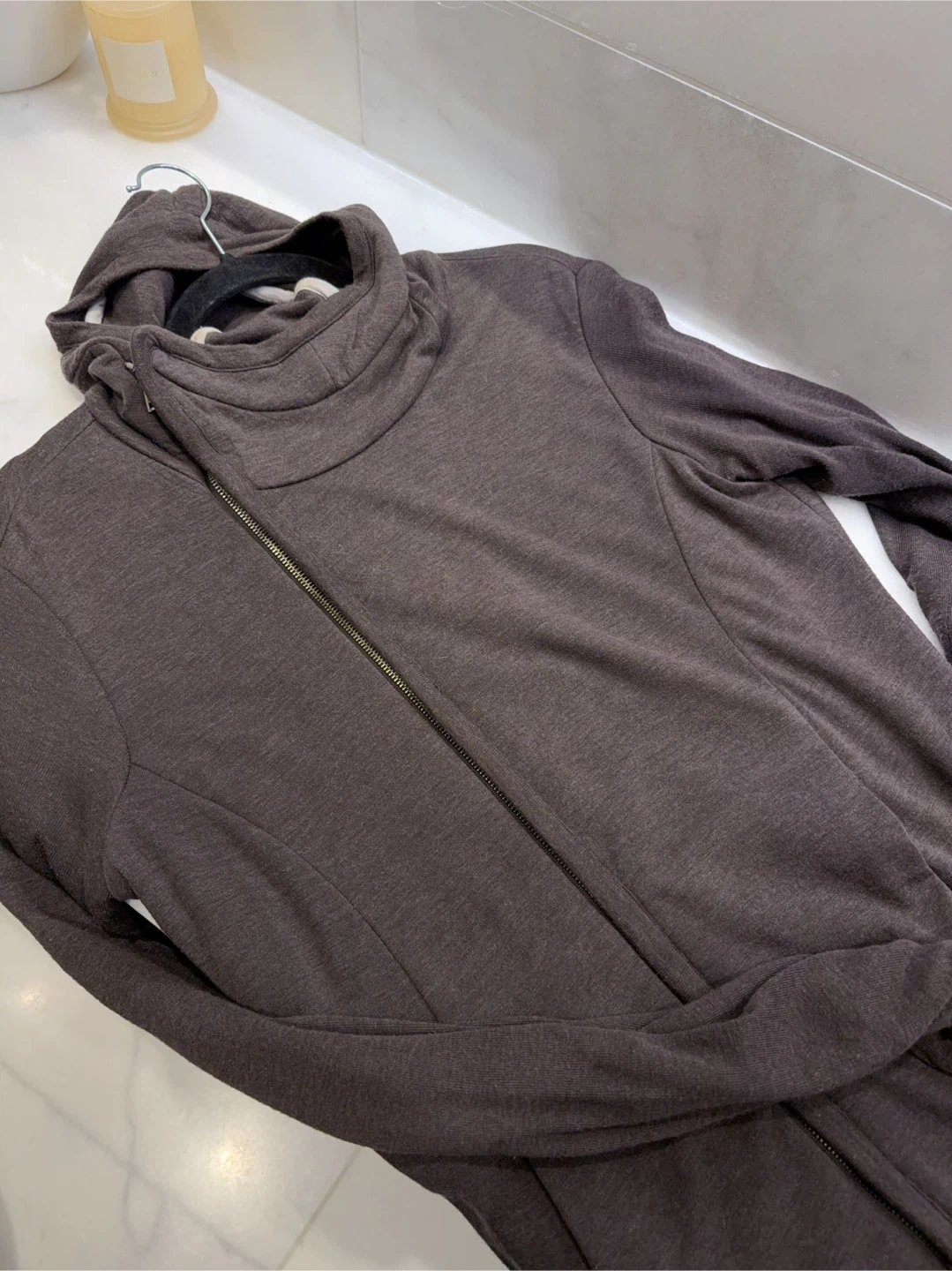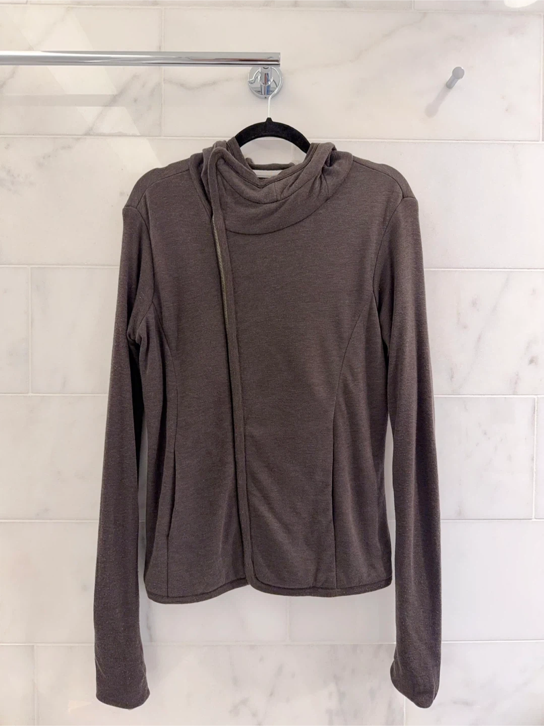 Rick Owens (Lilies line) women's hoodie in brown grey with a distinctive asymmetrical zip closure. It features a funnel neck and a hood for added warmth. Made with a soft fabric blend.
