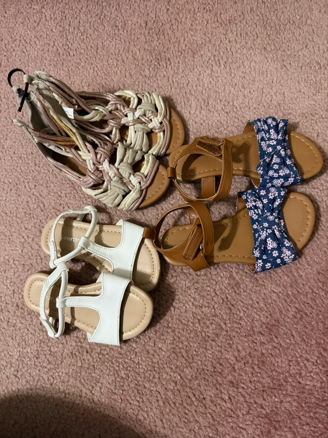 Four pairs of children's sandals and flip-flops. Includes woven straps, floral prints, and polka dots. Perfect for summer adventures!