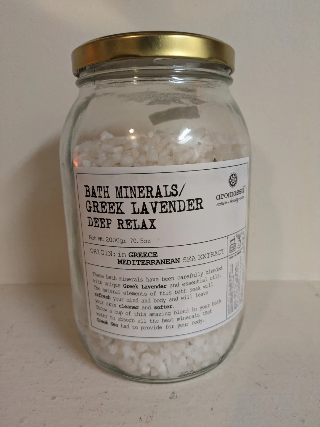 Aromasesti bath minerals with Greek Lavender and essential oils. Net weight 2000 grams. These minerals are from Greece and use Mediterranean Sea extract. They're blended to refresh your mind and body, leaving your skin cleaner and softer.
