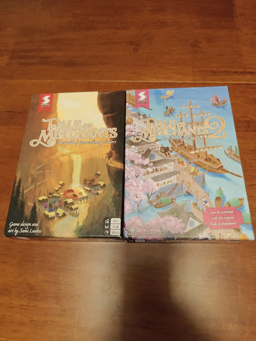 This listing includes Dale of Merchants: The Guild of Extraordinary Traders and Dale of Merchants 2: The Era of Trade Masters. Both games are designed for ages 10+ and play 2-4 players with a playtime of 30 minutes. They can be combined with the original Dale of Merchants!