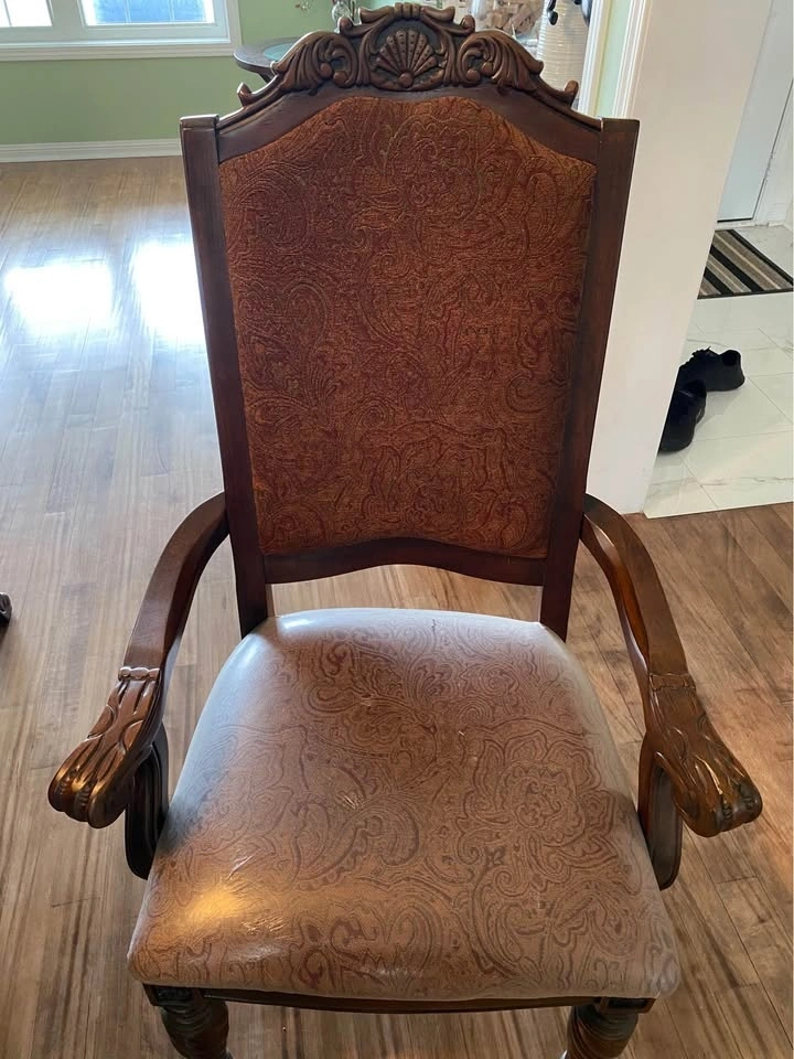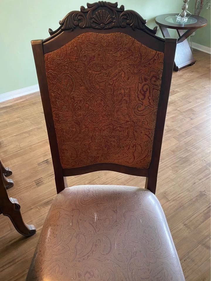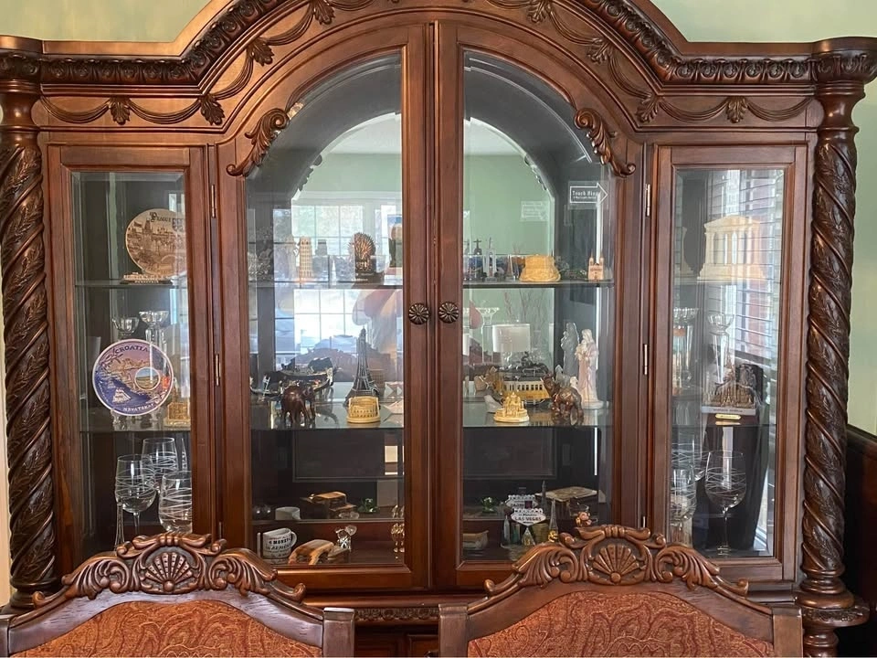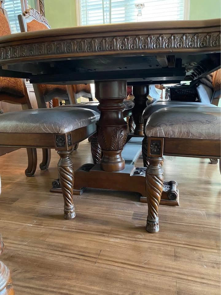 Practically brand-new dining table set, complete with 8 chairs, a middle extender, and a glass hutch. This Ashley brand set has never been used and still has the original plastic wrapping on the chairs.