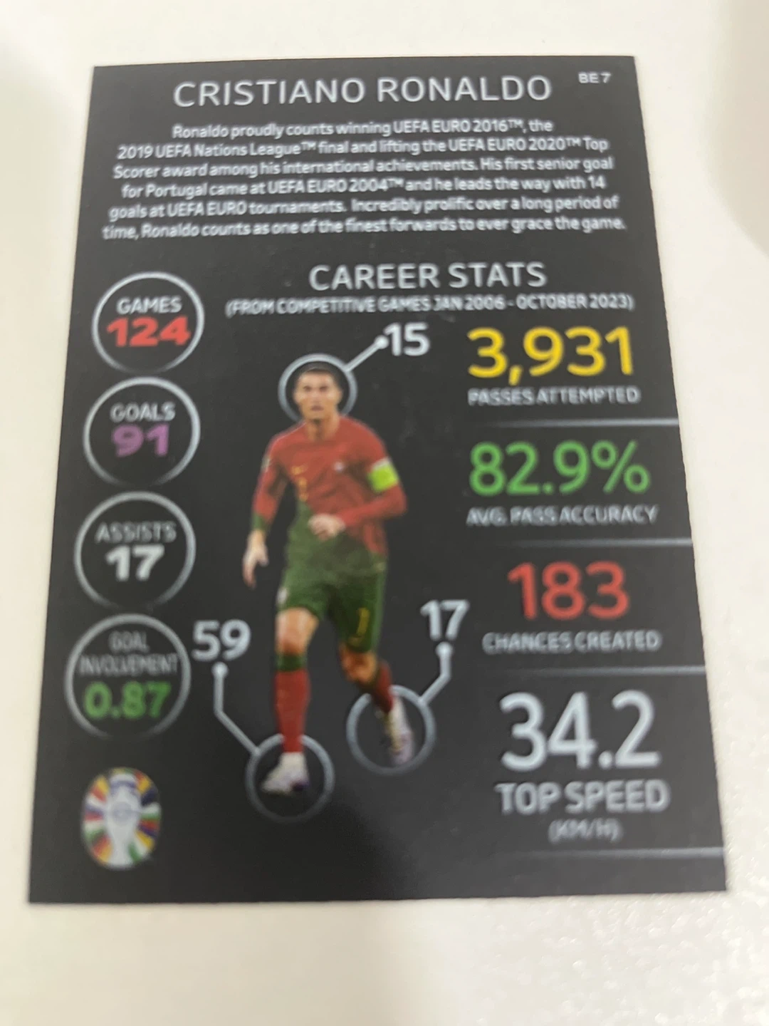 Selling a Cristiano Ronaldo Topps Black Edge Edition card. It features career stats from 2006 to October 2023, including 124 games, 91 goals, and 17 assists. The card also highlights Ronaldo's achievements, such as winning the 2019 UEFA Nations League.