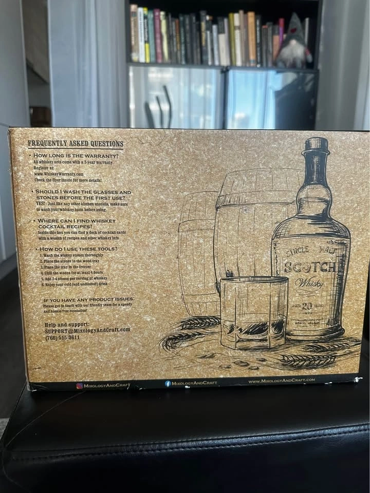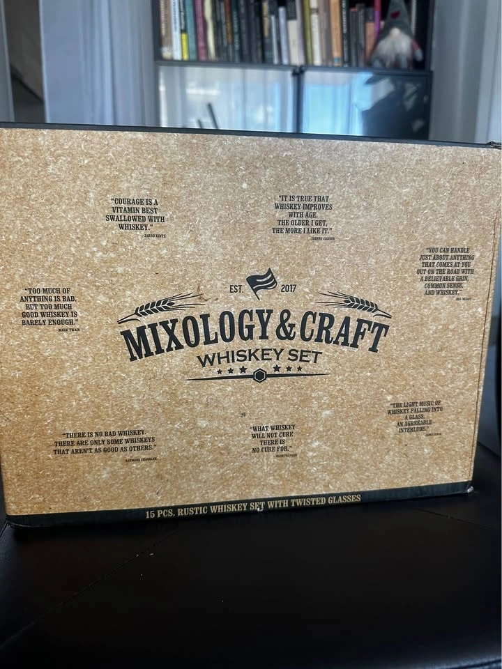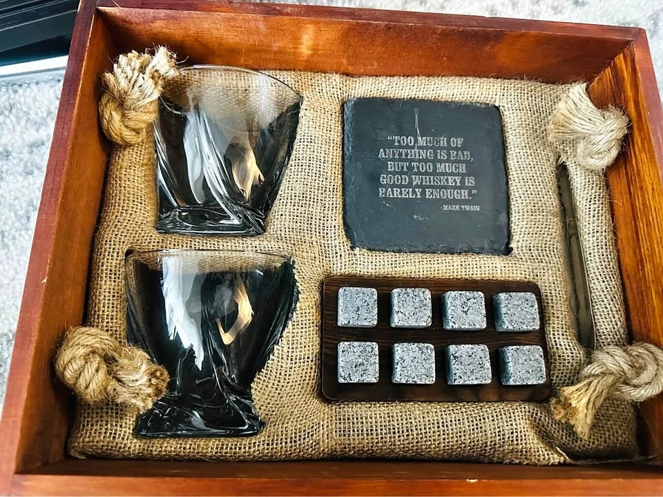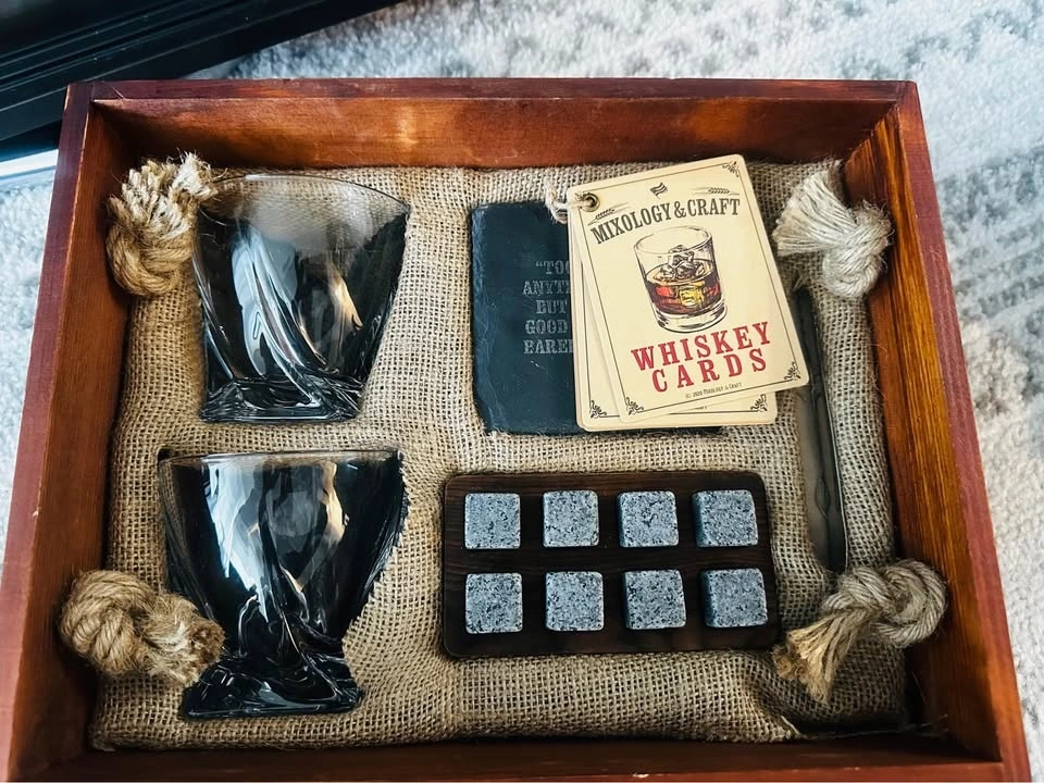 Brand new Whiskey Set by Mixology & Craft. Never used, in perfect condition — ideal as a gift. Set includes: 2 × whiskey glasses (10 oz each), premium granite chilling stones (reusable, do not dilute drinks), solid wooden storage box with engraved logo, and storage pouch with whiskey cards (as shown in photos). Details: Brand: Mixology & Craft, Condition: New – never used, Materials: glass, granite stones, solid wood box, Gift-ready presentation. Perfect for whiskey, bourbon, or scotch lovers. Great gift for birthdays, housewarming, Father’s Day, or holidays. Pickup in New Westminster (or nearby). Cash or e-transfer accepted.