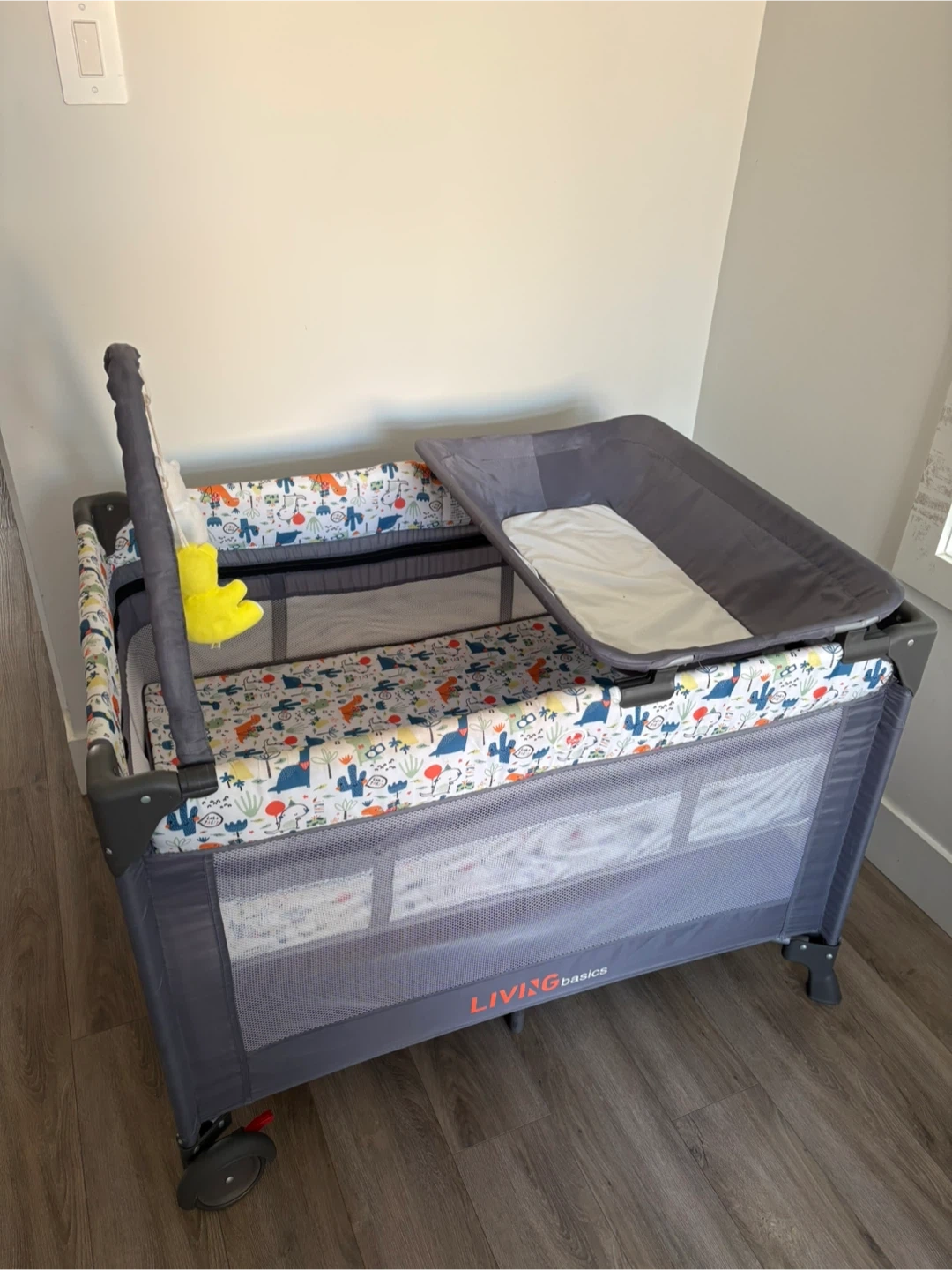 This Living Basics playpen comes with a bassinet and changing station. It features a colourful, playful dinosaur and cactus pattern on the sides. Perfect for keeping your little one entertained and safe.