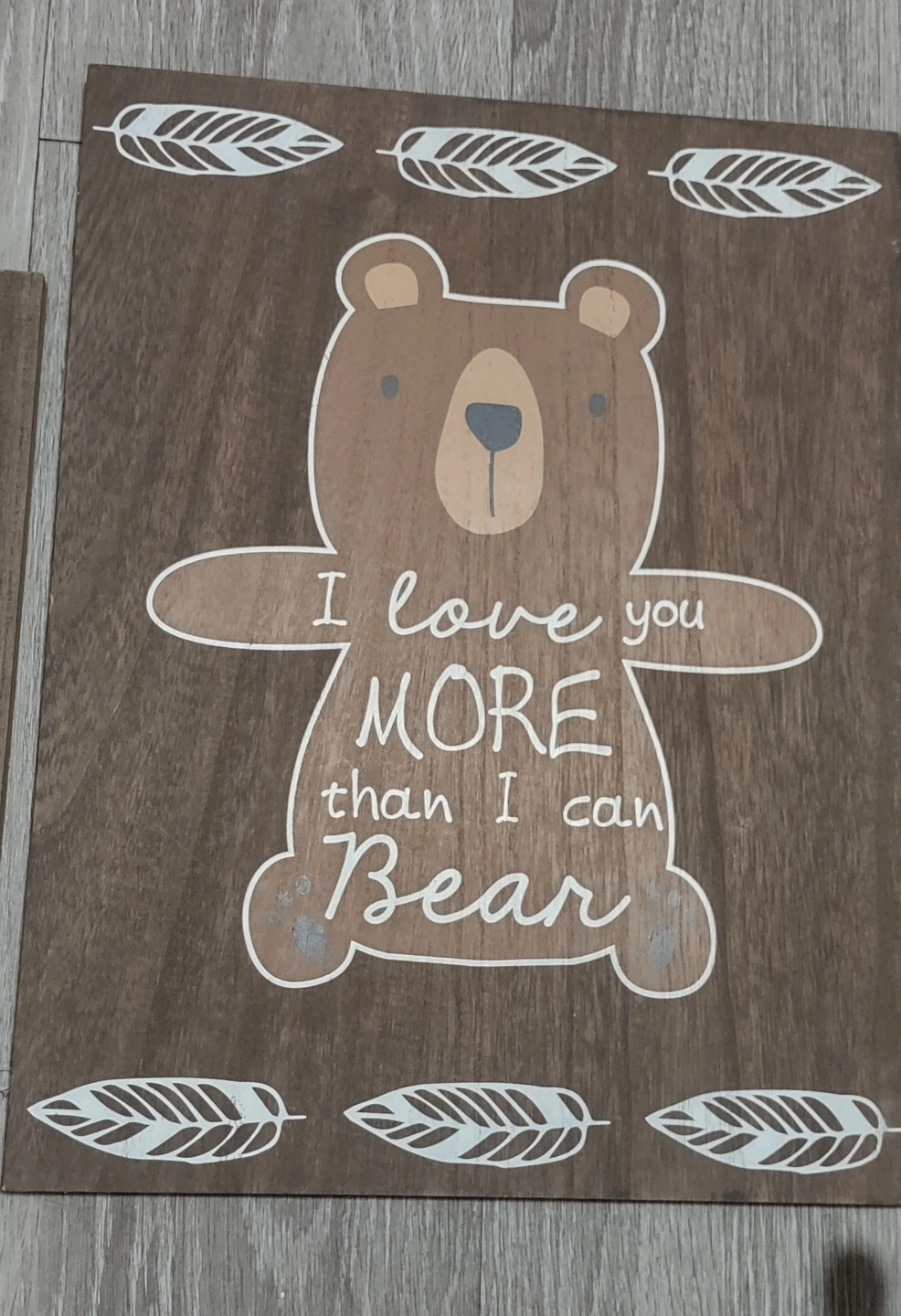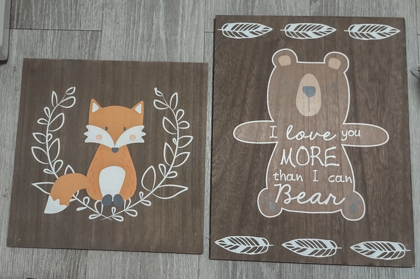 Adorable set of two square wooden prints. Features a cute fox and a bear with a heartwarming message. Perfect for a nursery or child's room. Simple, charming design. each $10. $Together $15