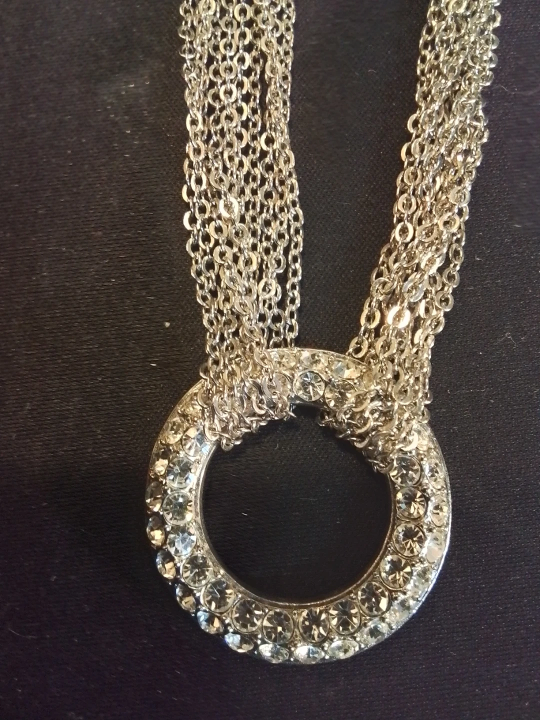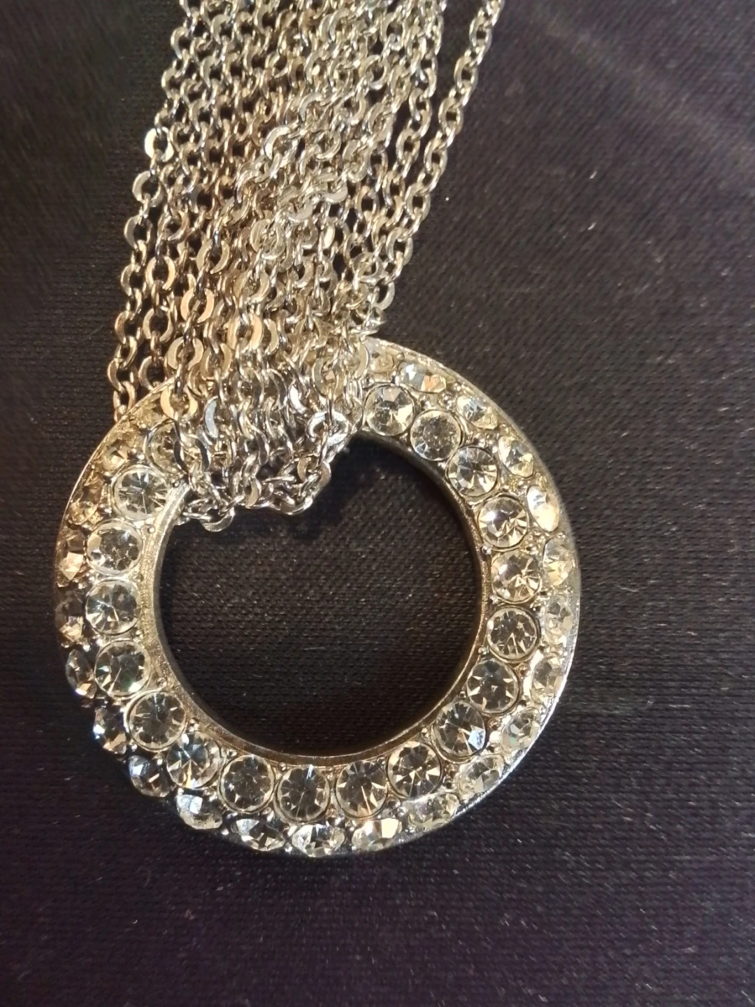 This is a Gold Center Florence necklace featuring a stunning circle pendant adorned with sparkling stones and a multi-strand chain in excellent condition. It comes with its original case, perfect for gifting or safekeeping. The necklace is an elegant statement piece that adds a touch of glamour to any outfit.