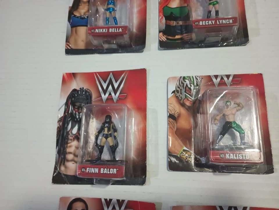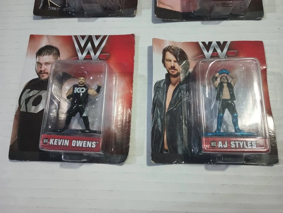 Lot of 9 WWE Nano METALFIGS die cast toy figures from Jada Toys. Set of 9 figures in sealed packages but the hang tops of packages have been cut off. Figures included are: W13 AJ STYLES, W14 KEVIN OWENS, W15 SETH ROLLINS, W16 FINN BALOR, W17 SASHA BANKS, W18 BROCK LESNAR, W19 BECKY LYNCH, W20 KALISTO, W22 NIKKI BELLA. $25 for the lot. From a smoke-free/bug-free home in Charleswood.