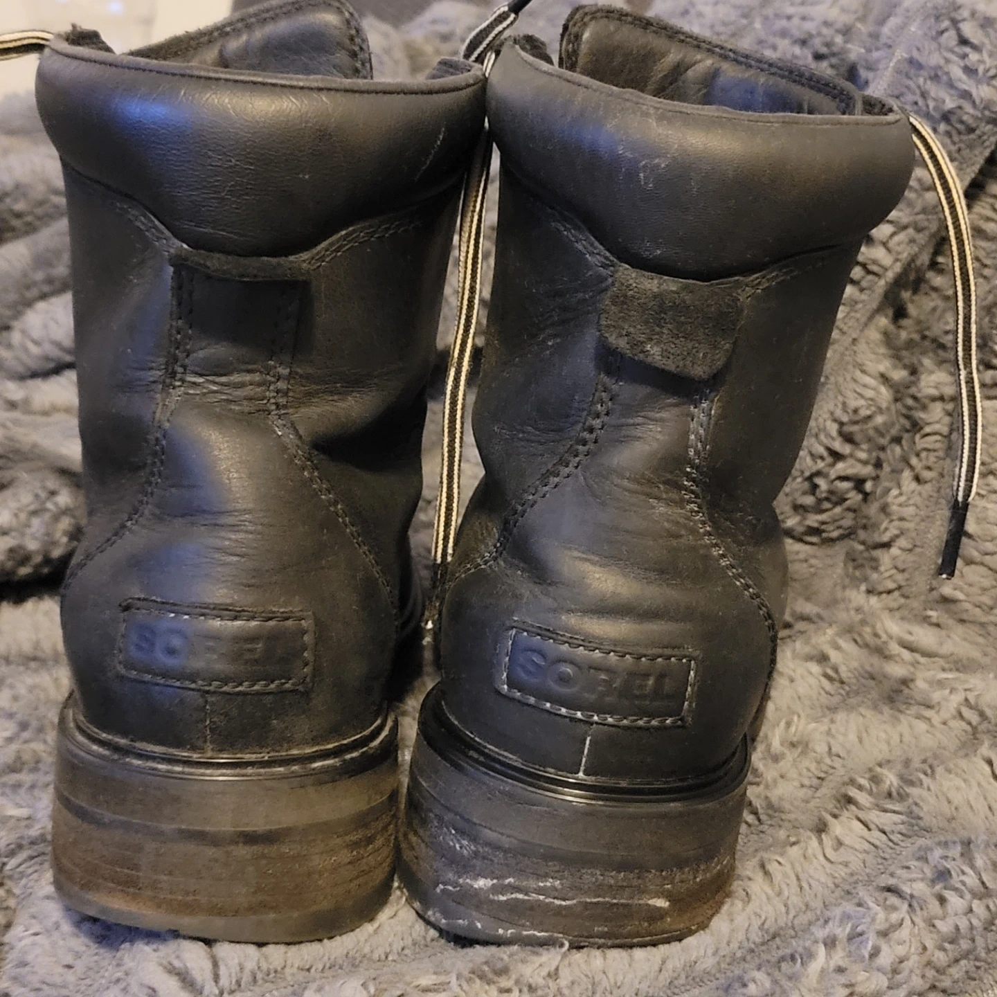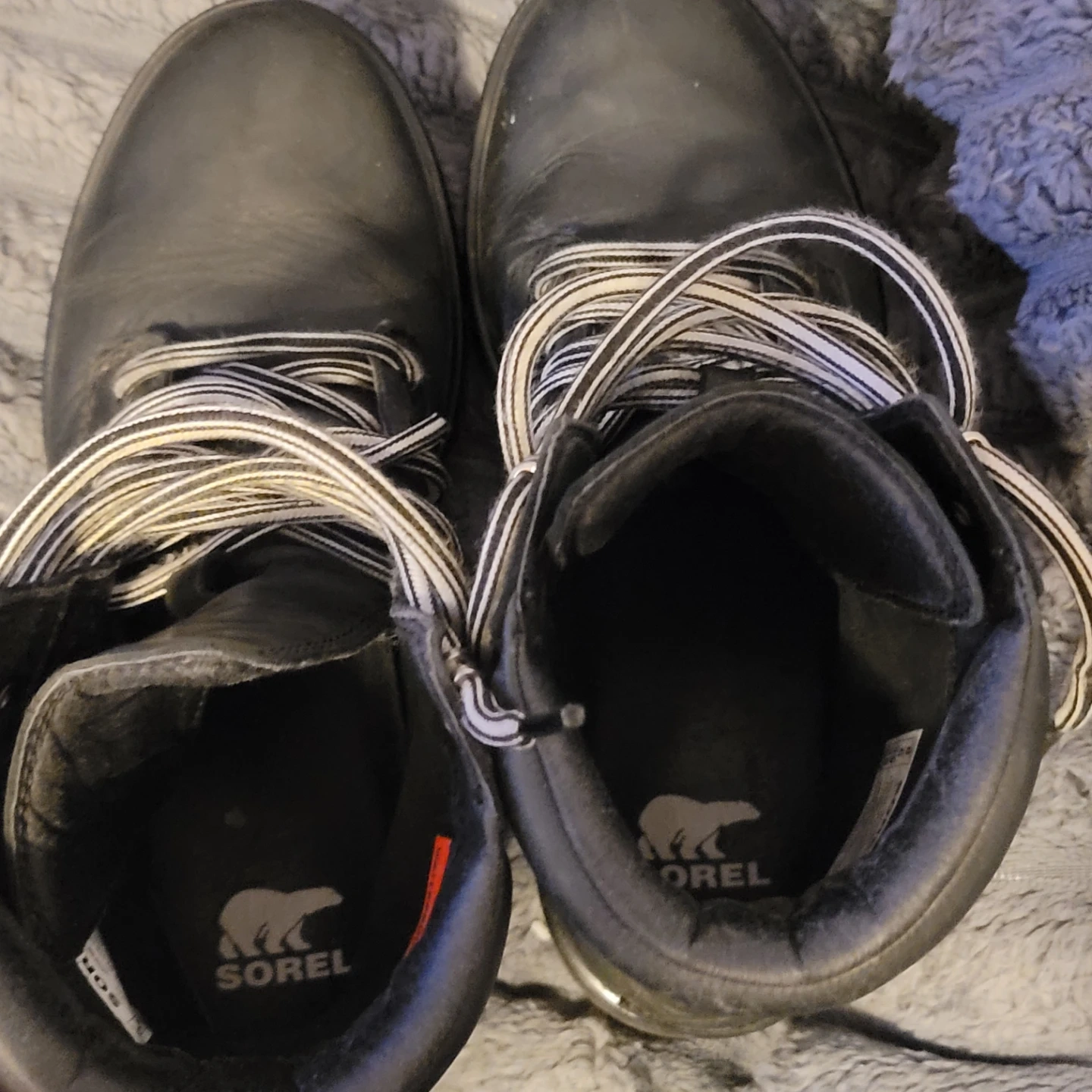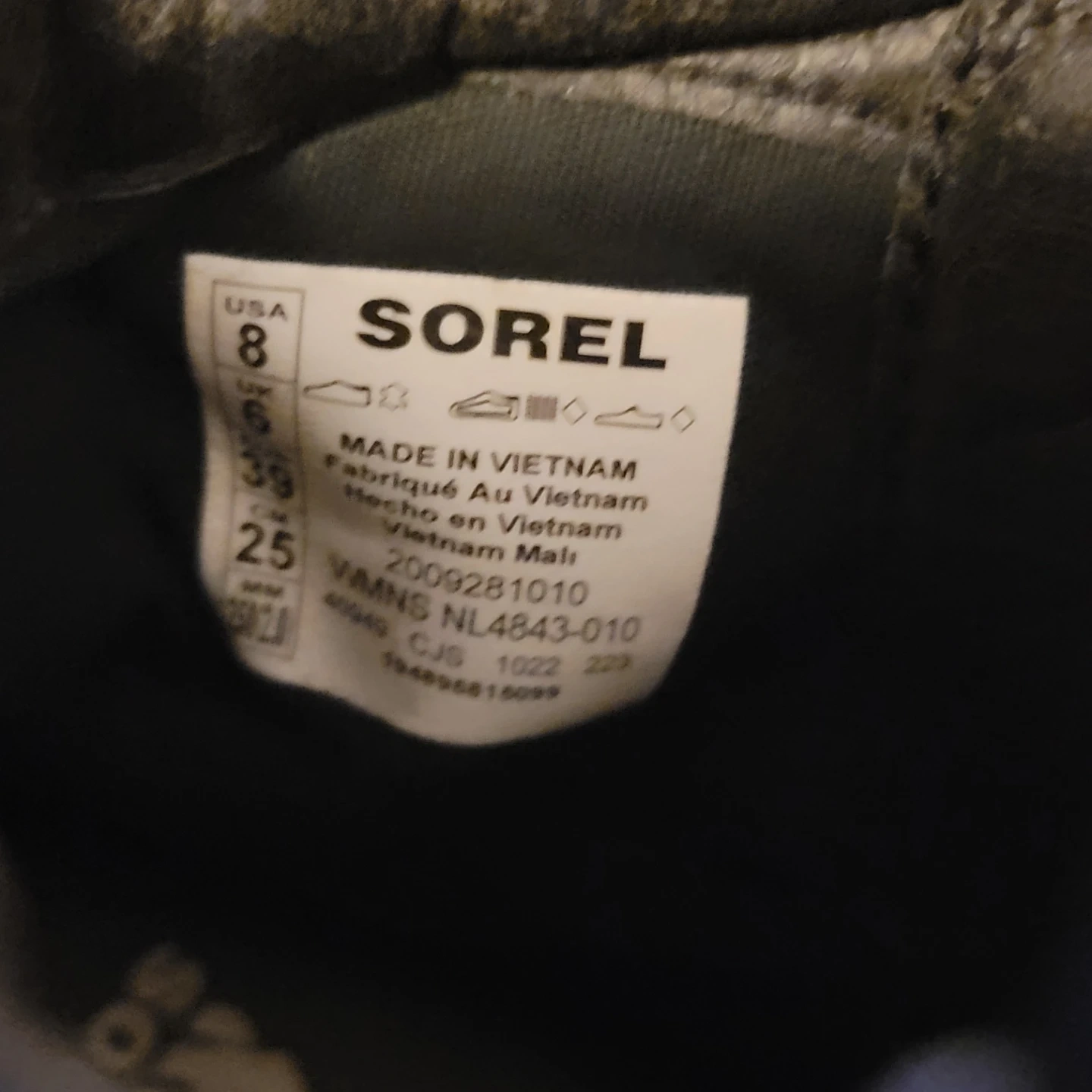 Black Sorel waterproof winter boots in size 8. These boots are made in Vietnam. They're great for cold weather conditions!