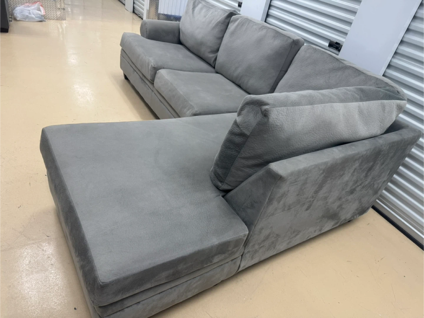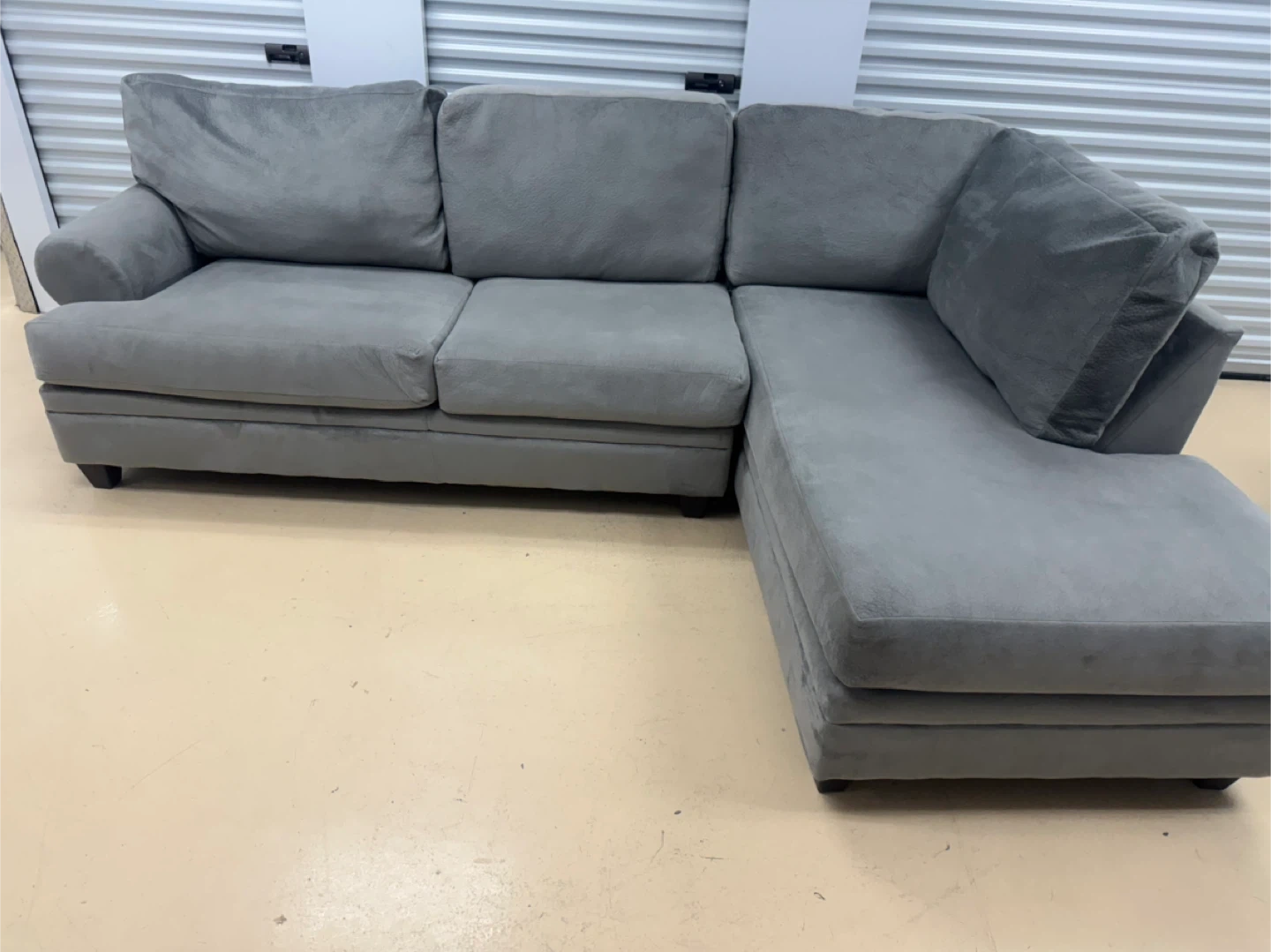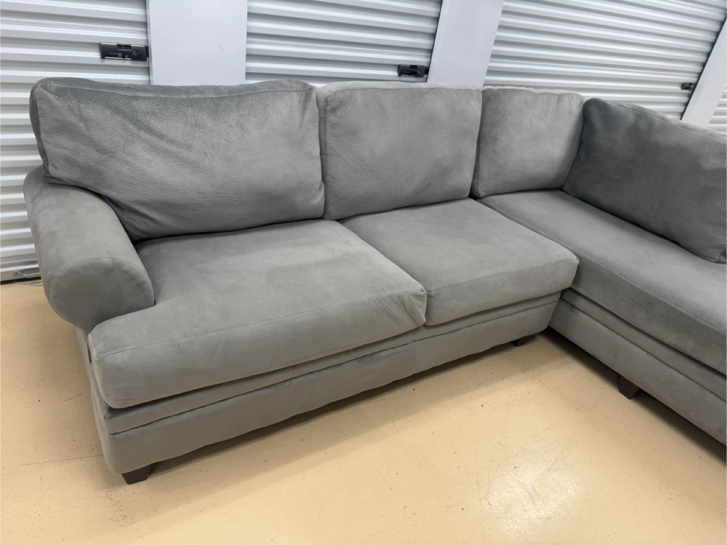 A comfortable grey sectional sofa. It's made of a soft fabric material. This sofa is great for lounging in your living room.good condition home delivery available