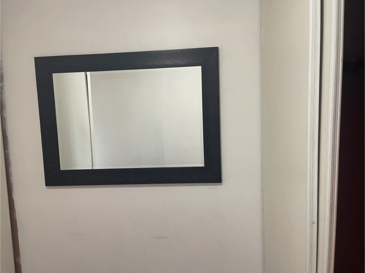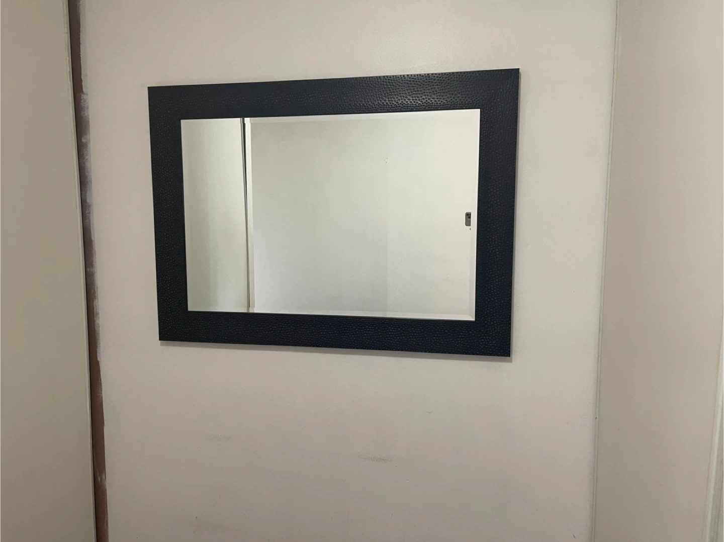 Decorative rectangular wall mirror. It has a textured black frame. This mirror's size makes it suitable for an entryway or hallway.