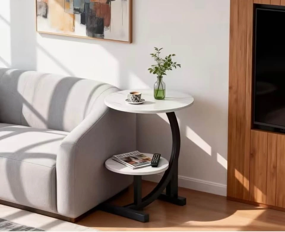 Modern light luxury double-layer side table with a metal frame. This small coffee table offers storage and can be used as a round sofa table for the living room, a bedside table for the bedroom, or on the patio. Suitable for various scenarios.