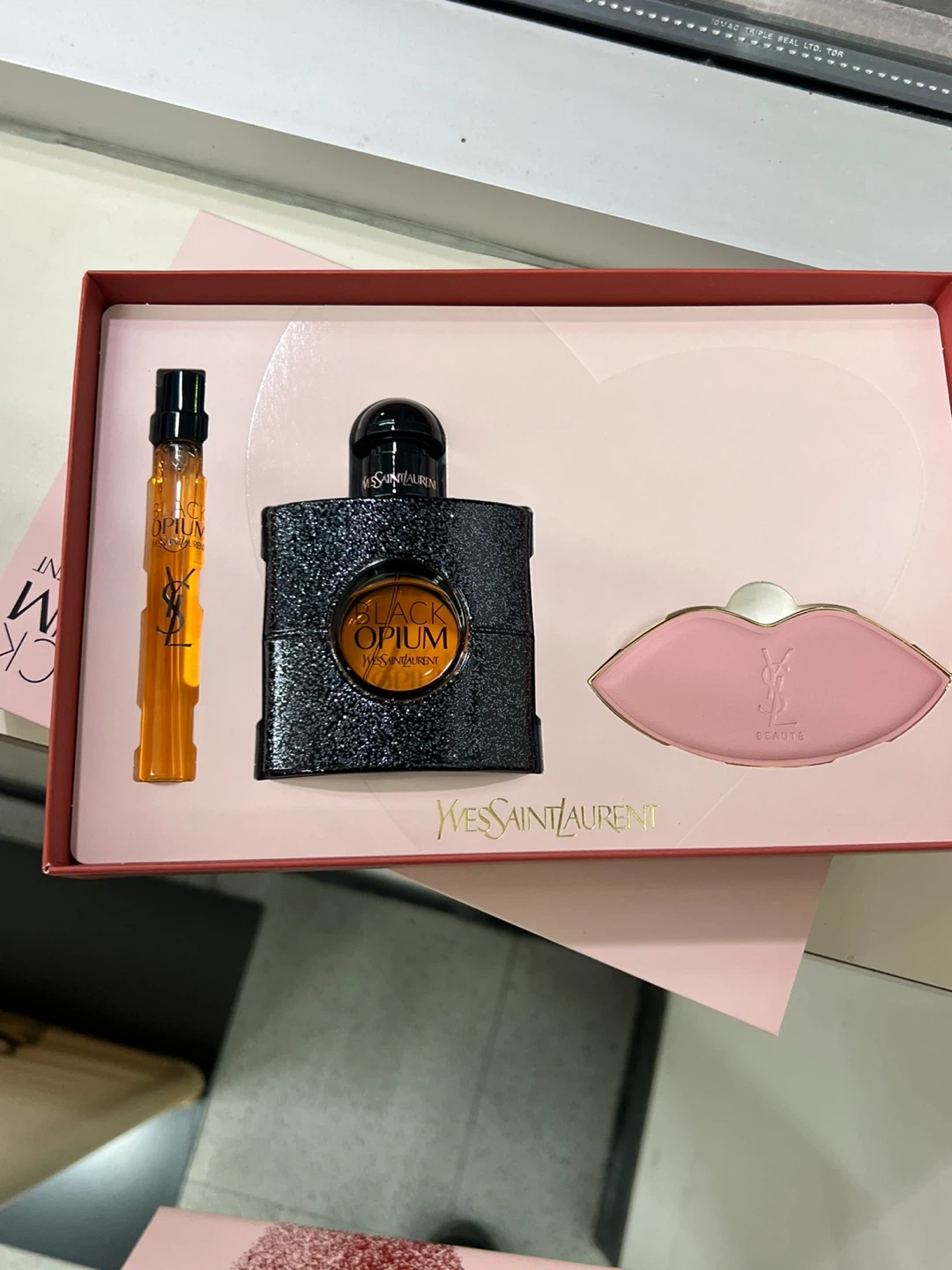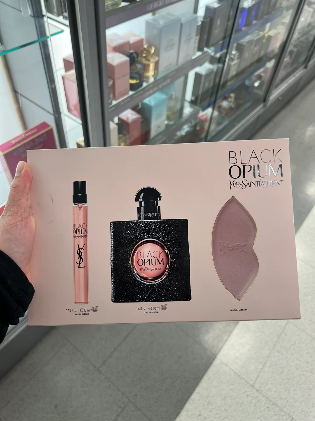 This Yves Saint Laurent Black Opium gift set includes a 50ml Eau de Parfum, a 10 ml travel spray, and a lip-shaped mirror. It's a perfect scent for evening wear. Made in France.