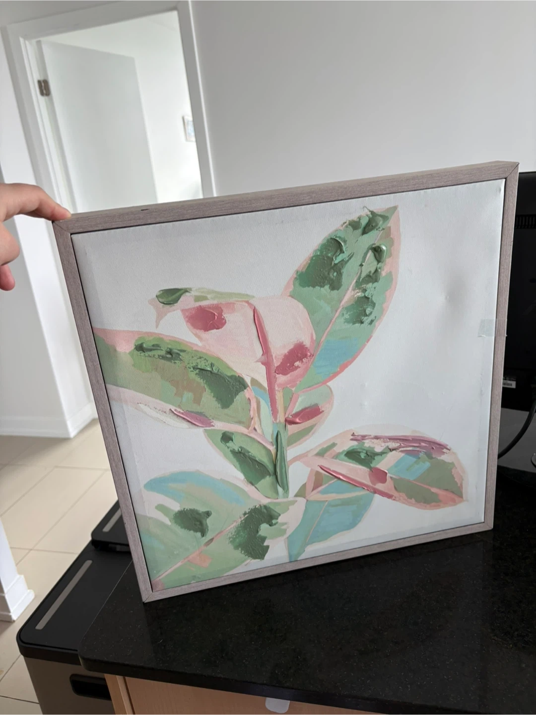 Textured wall art featuring a rubber plant design. It's framed in a light grey wood-look material. This piece adds a touch of nature-inspired decor.