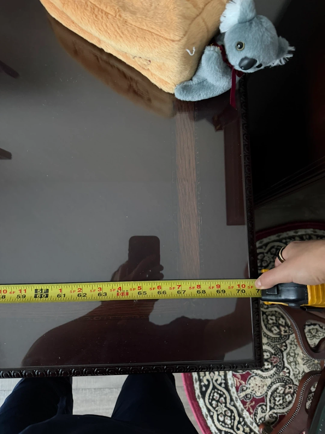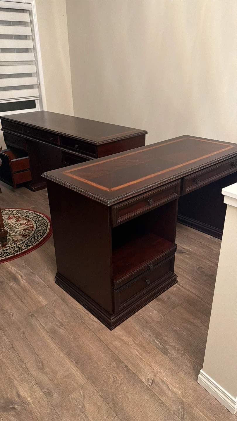 The desks are Bombay high-quality wood with a special sized glass for the top. They are 2ft wide and one desk is 10ft long and the other desk is 6 ft.
