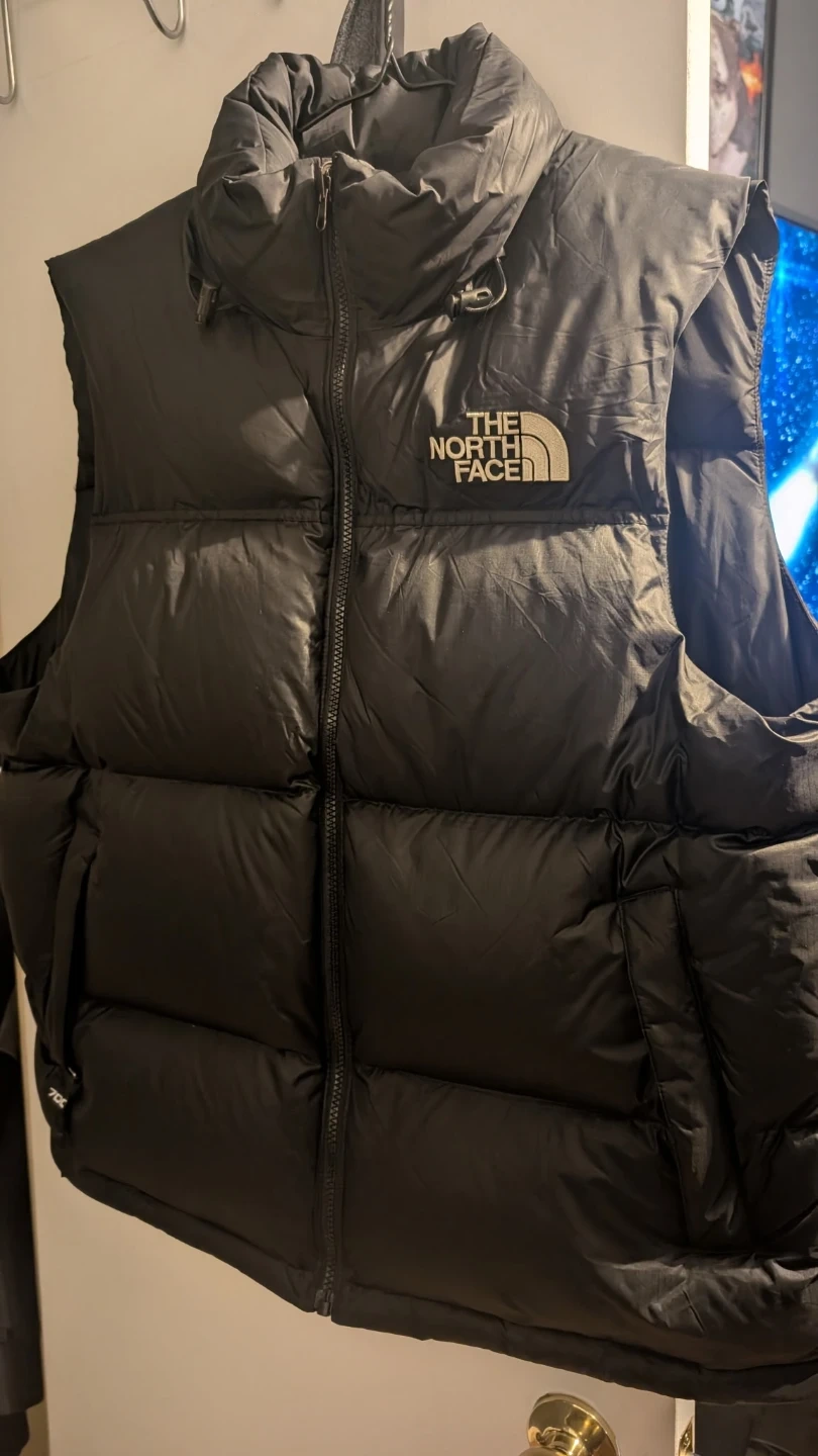 This is a used black puffer vest from The North Face. It's a men's size large. The vest is made with a durable shell and insulated fill for warmth.