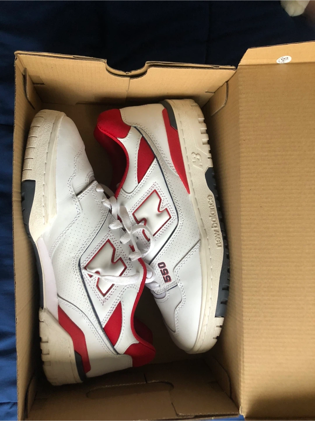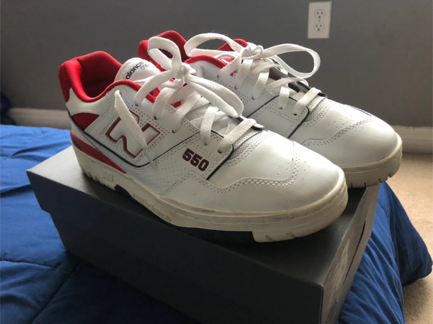 These New Balance 550 sneakers are white with red accents. They come in their original box. Classic basketball-inspired design! Size 9 men’s