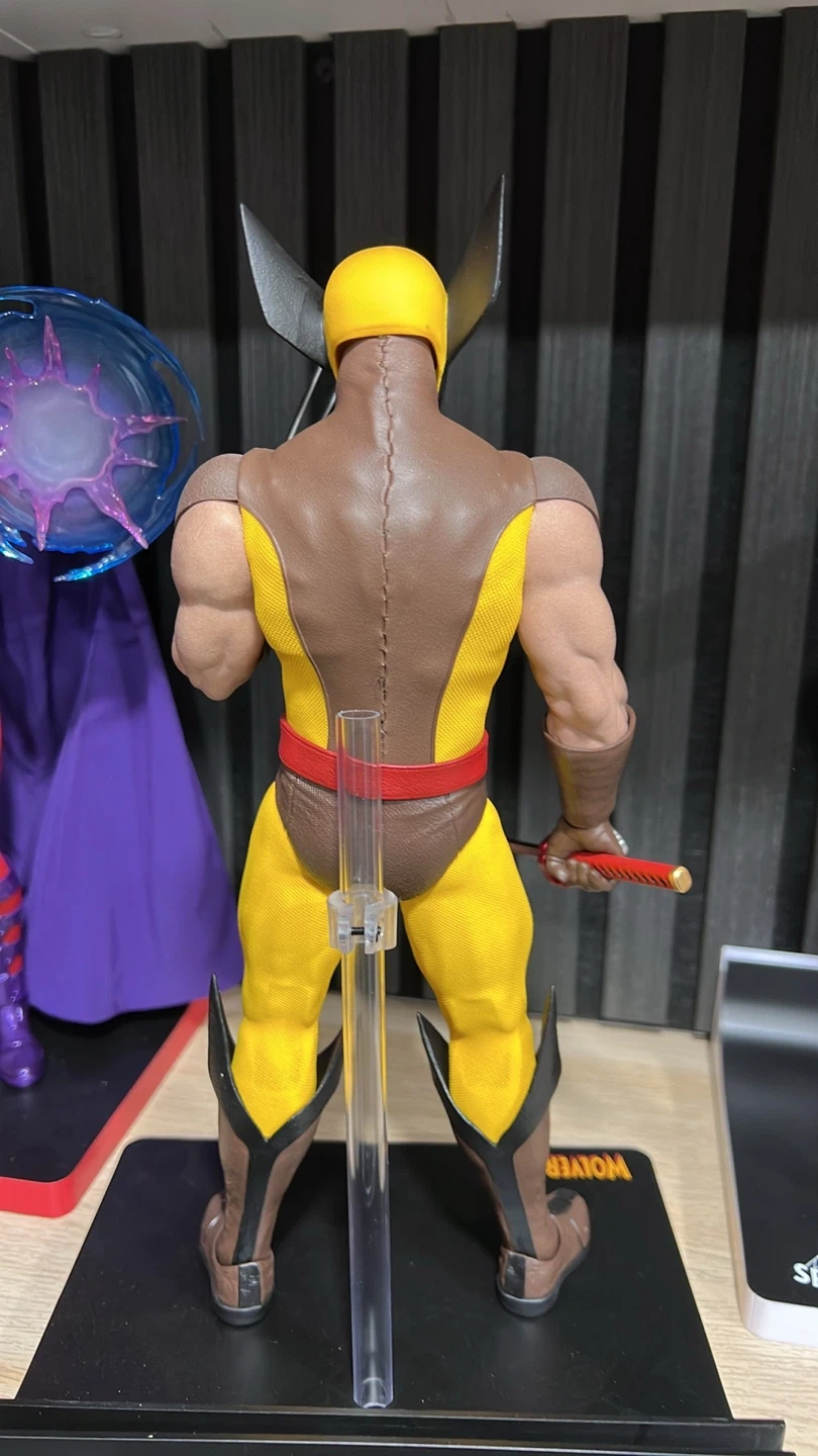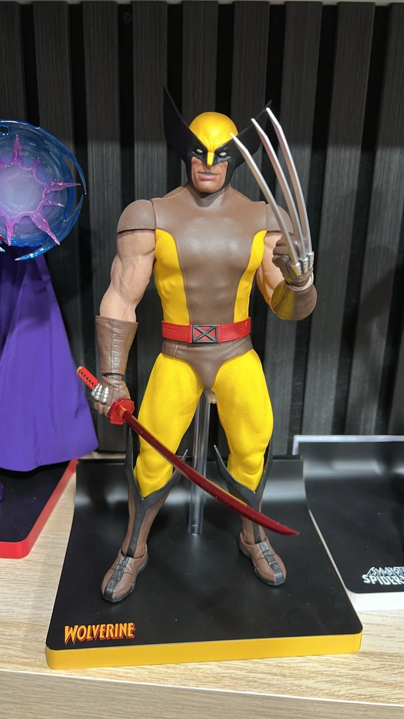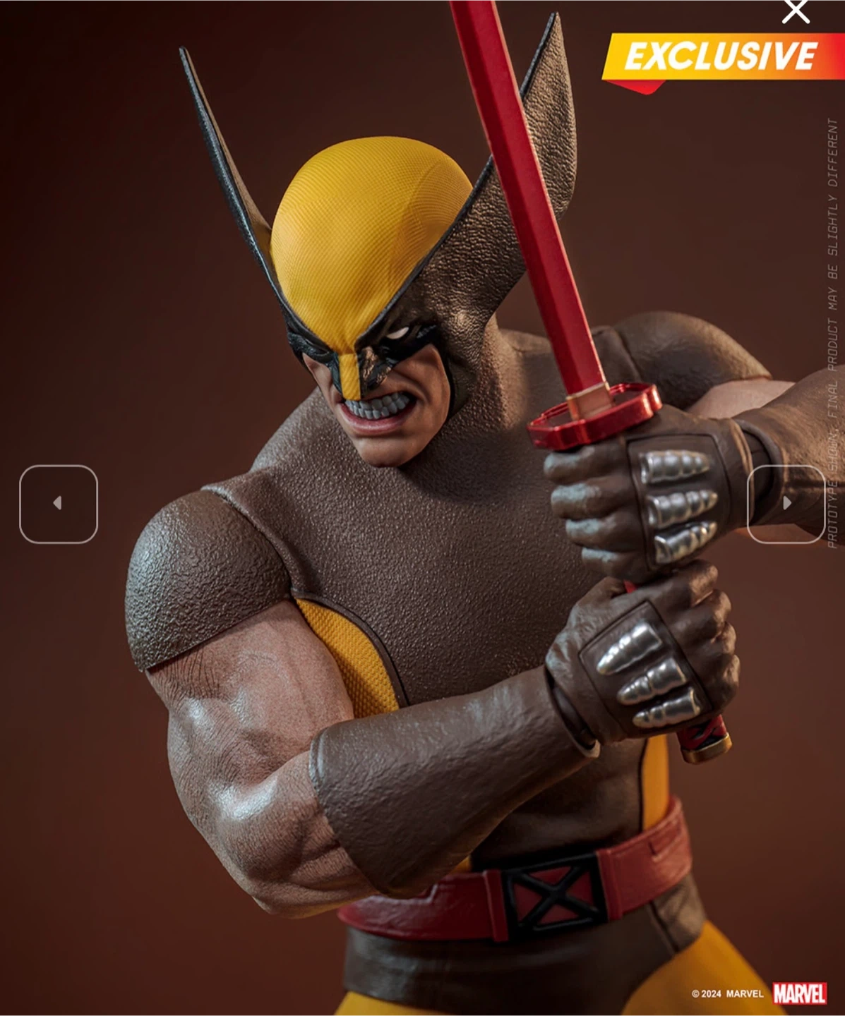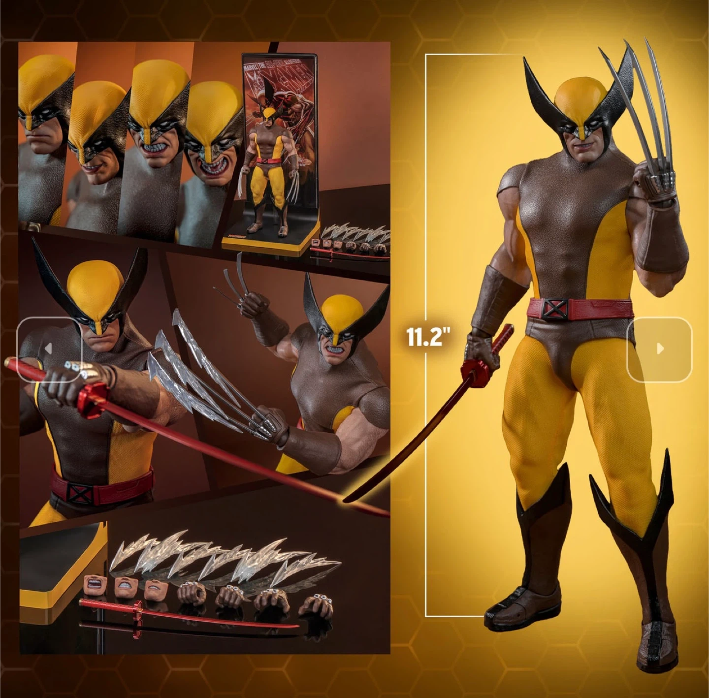 This is a 1/6 scale "Brown Costume" Wolverine figure. It stands 11.2 inches tall and comes with multiple interchangeable hands and accessories, including his signature claws and a katana. This collectible is a must-have for any Marvel fan!