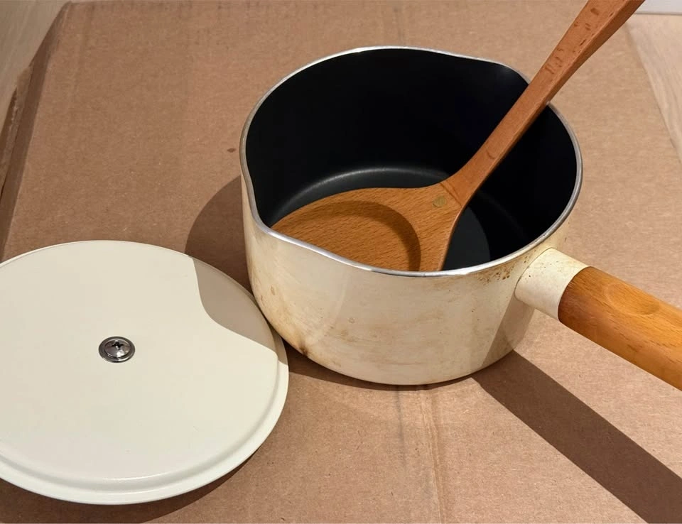 Selling this beautiful, cream-colored ceramic saucepan. It has a minimalist, Scandinavian-inspired design that looks great on any stovetop.